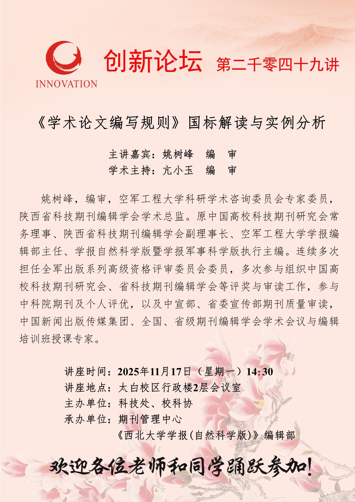 姚树峰 编审 必赢3003no1线路检测中心创新论坛第二千零四十九讲:《学术论文编写规则》国标解读与实例分析 讲座时间 2025年11月17日(星期一)14:30 讲座地点 太白校区行政楼2层会议室 讲座人介绍 姚树峰 编审 讲座内容