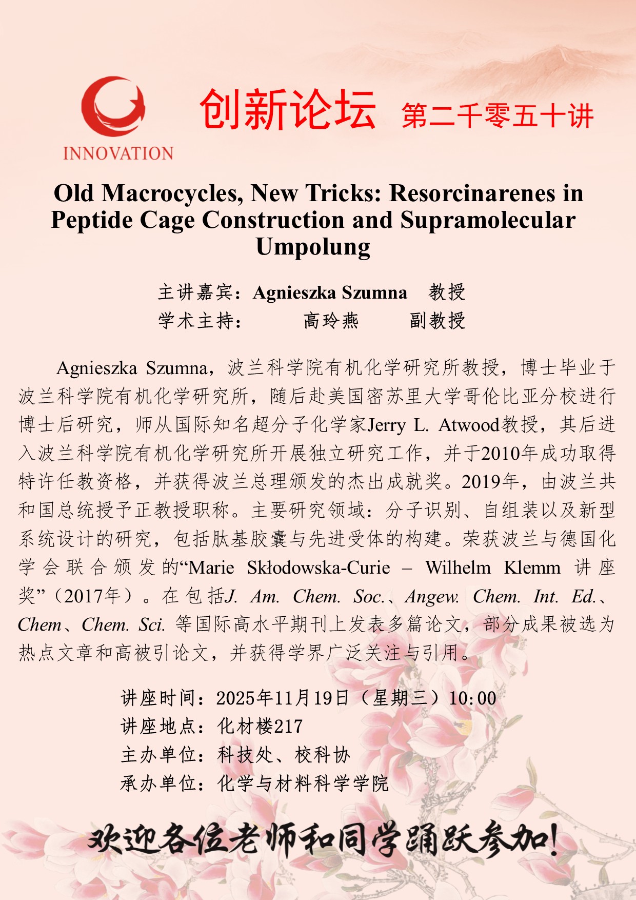 Agnieszka Szumna 教授 必赢3003no1线路检测中心创新论坛第二千零五十讲:Old Macrocycles, New Tricks: Resorcinarenes in Peptide Cage Construction and Supramolecular Umpolung 讲座时间 2025年11月19日(星期三)10:00 讲座地点 化材楼217 讲座人介绍 Agnieszka Szumna 教授 讲座内容