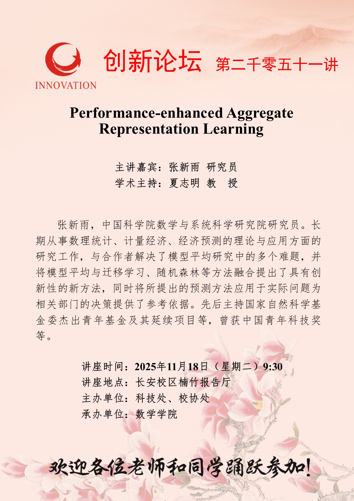 张新雨 研究员 必赢3003no1线路检测中心创新论坛第二千零五十一讲:Performance-enhanced Aggregate Representation Learning 讲座时间 2025年11月18日(星期二)9:30 讲座地点 长安校区楠竹报告厅 讲座人介绍 张新雨 研究员 讲座内容
