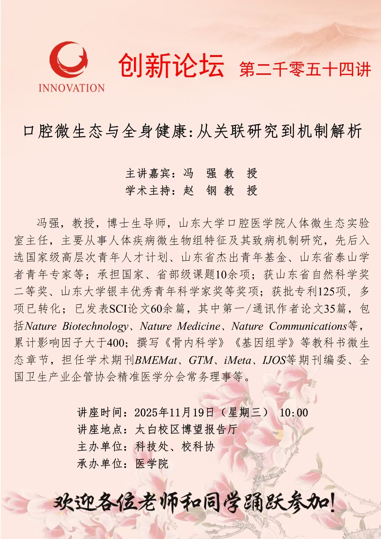 冯强 教授 必赢3003no1线路检测中心创新论坛第二千零五十四讲:口腔微生态与全身健康:从关联研究到机制解析 讲座时间 2025年11月19日(星期三) 10:00 讲座地点 太白校区博望报告厅 讲座人介绍 冯强 教授 讲座内容