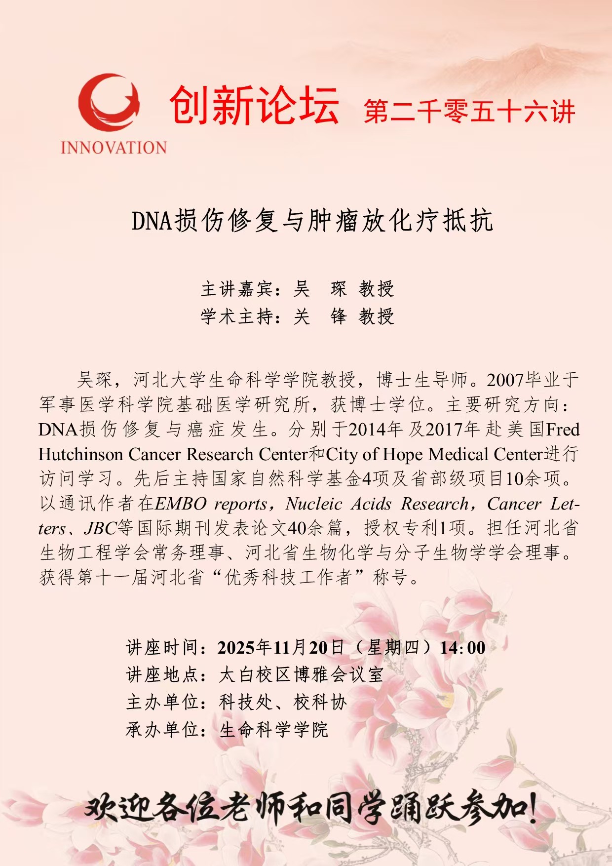 吴琛 教授 必赢3003no1线路检测中心创新论坛第二千零五十六讲:DNA损伤修复与肿瘤放化疗抵抗 讲座时间 2025年11月20日(星期四)14:00 讲座地点 太白校区博雅会议室 讲座人介绍 吴琛 教授 讲座内容