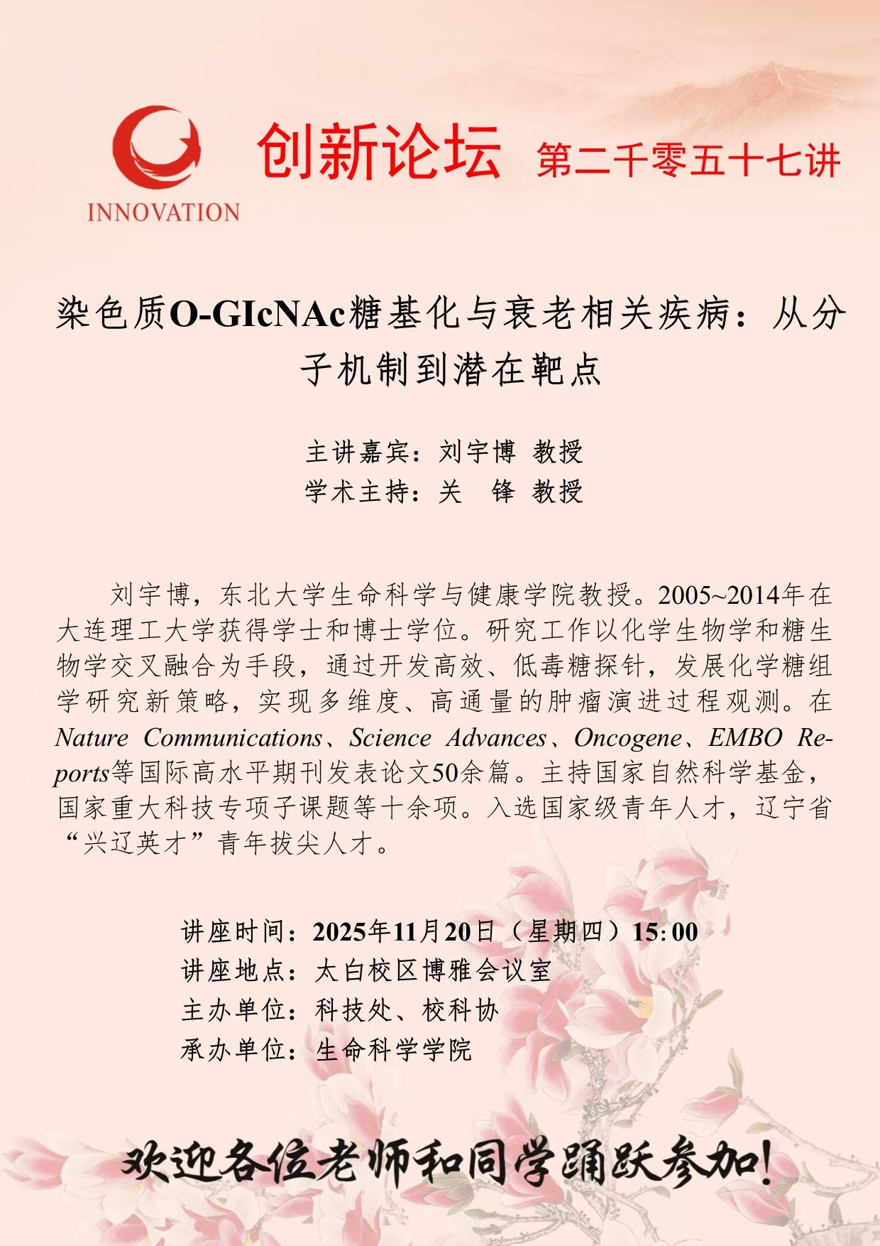 刘宇博 教授 必赢3003no1线路检测中心创新论坛第二千零五十七讲:染色质O-GIcNAc糖基化与衰老相关疾病:从分子机制到潜在靶点 讲座时间 2025年11月20日(星期四)15:00 讲座地点 太白校区博雅会议室 讲座人介绍 刘宇博 教授 讲座内容