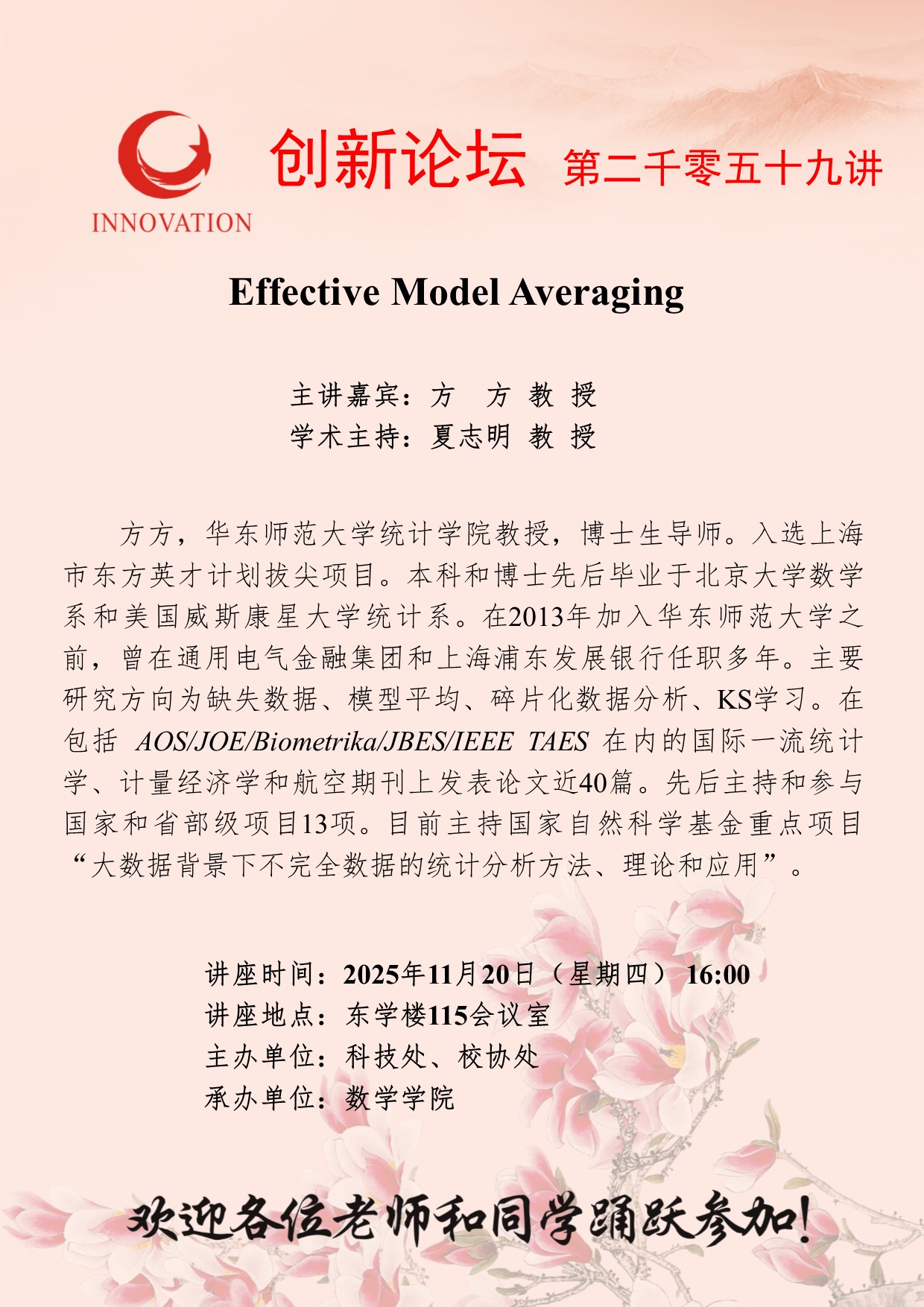 方方 教授 必赢3003no1线路检测中心创新论坛第二千零五十九讲:Effective Model Averaging 讲座时间 2025年11月20日(星期四) 16:00 讲座地点 东学楼115会议室 讲座人介绍 方方 教授 讲座内容
