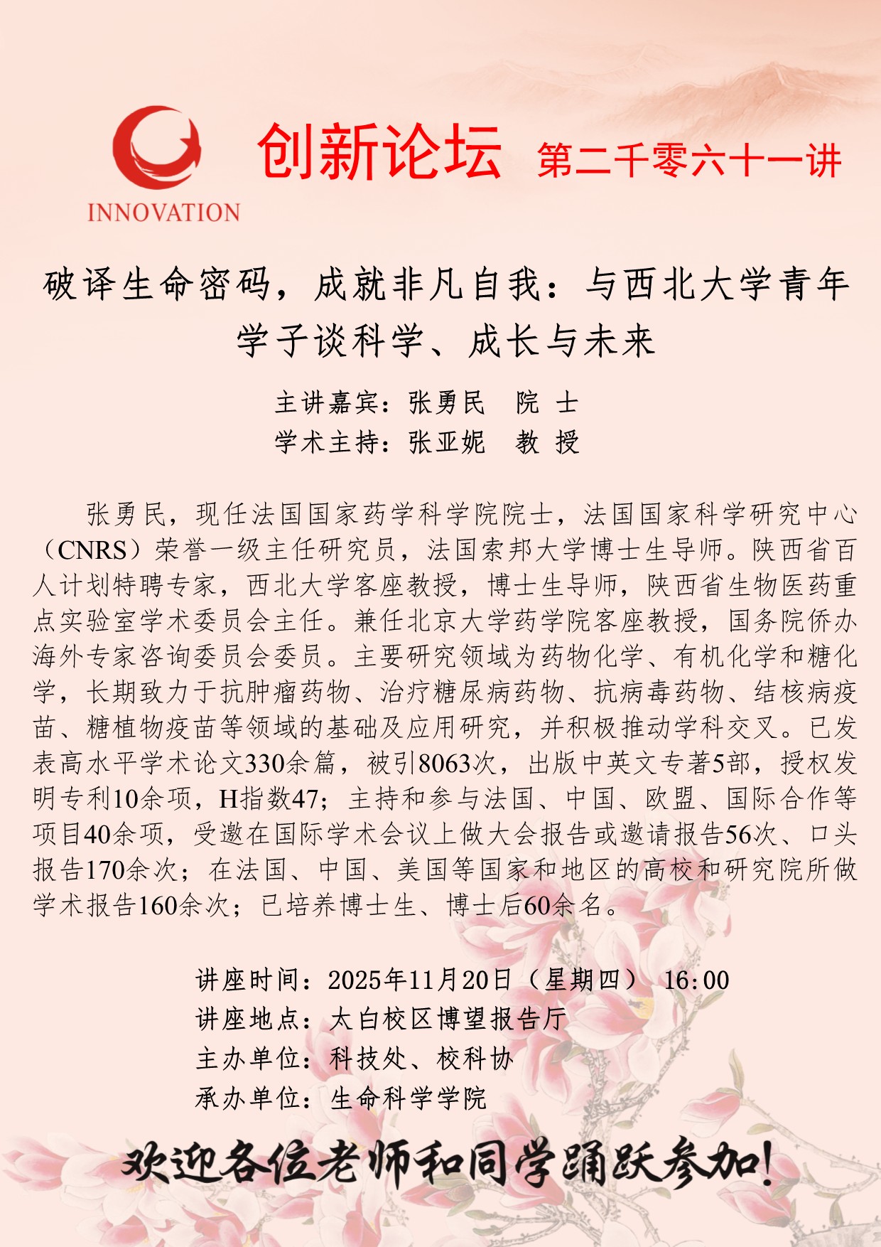 张勇民 院士 必赢3003no1线路检测中心创新论坛第二千零六十一讲:破译生命密码,成就非凡自我:与必赢3003no1线路检测中心青年学子谈科学、成长与未来 讲座时间 2025年11月20日(星期四) 16:00 讲座地点 太白校区博望报告厅 讲座人介绍 张勇民 院士 讲座内容