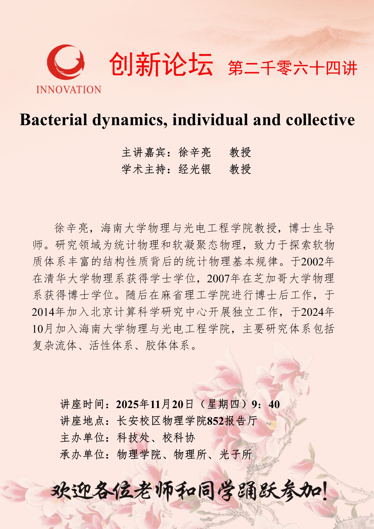 徐辛亮 教授 必赢3003no1线路检测中心创新论坛第二千零六十四讲:Bacterial dynamics, individual and collective 讲座时间 2025年11月20日(星期四)9:40 讲座地点 长安校区物理学院852报告厅 讲座人介绍 徐辛亮 教授 讲座内容