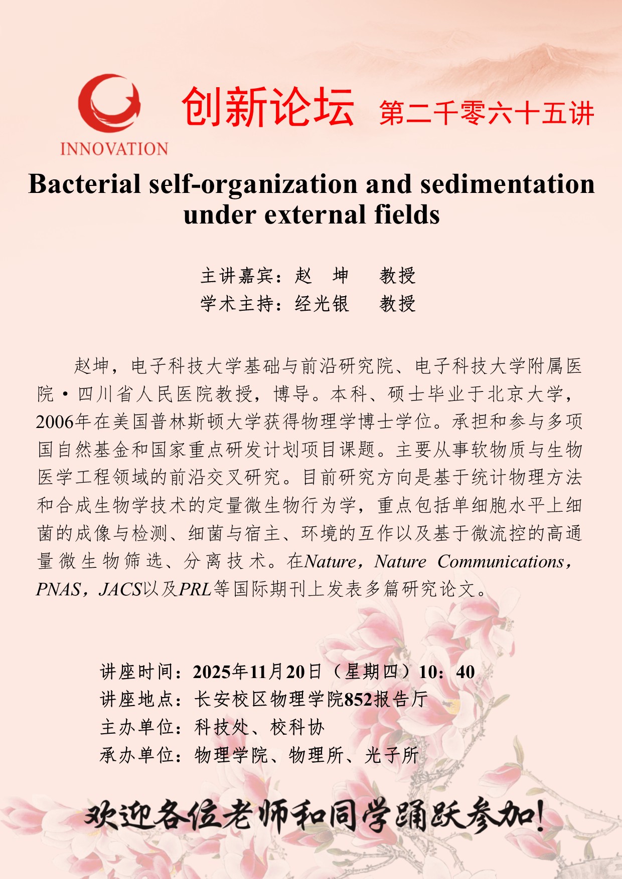 赵坤 教授 必赢3003no1线路检测中心创新论坛第二千零六十五讲:Bacterial self-organization and sedimentation under external fields 讲座时间 2025年11月20日(星期四)10:40 讲座地点 长安校区物理学院852报告厅 讲座人介绍 赵坤 教授 讲座内容