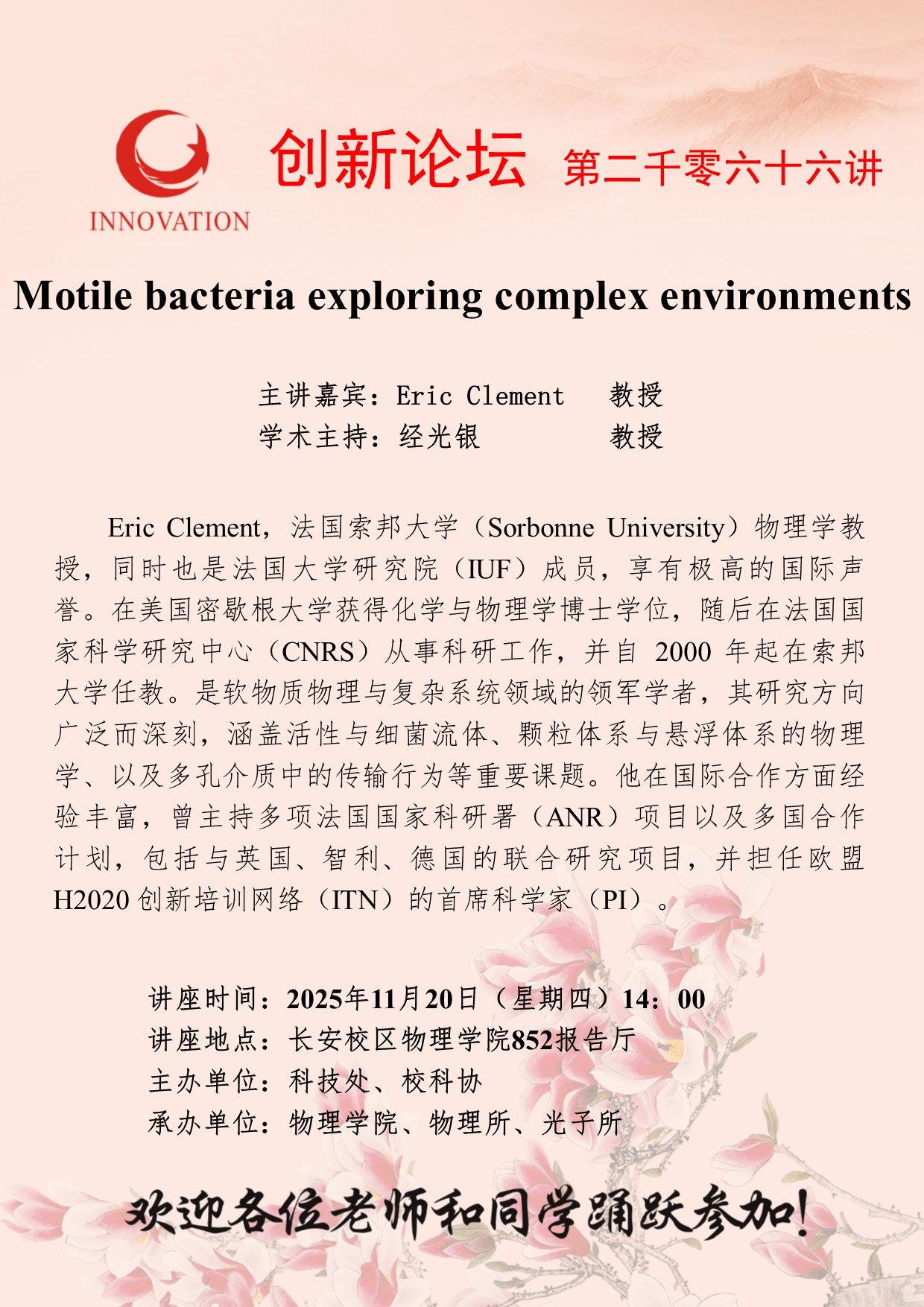 Eric Clement 教授 必赢3003no1线路检测中心创新论坛第二千零六十六讲:Motile bacteria exploring complex environments 讲座时间 2025年11月20日(星期四)14:00 讲座地点 长安校区物理学院852报告厅 讲座人介绍 Eric Clement 教授 讲座内容
