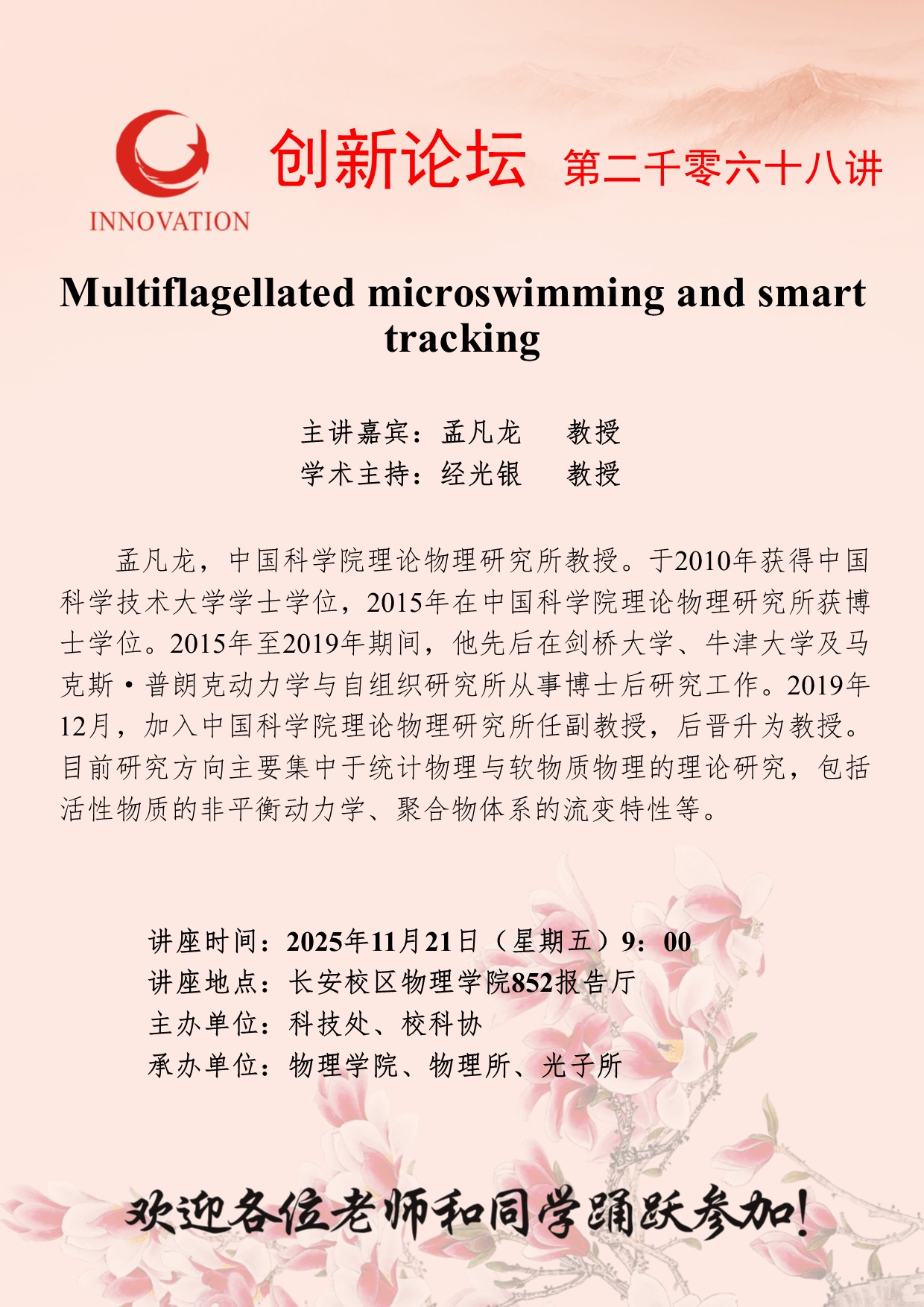 孟凡龙 教授 必赢3003no1线路检测中心创新论坛第二千零六十八讲:Multiflagellated microswimming and smart tracking 讲座时间 2025年11月21日(星期五)9:00 讲座地点 长安校区物理学院852报告厅 讲座人介绍 孟凡龙 教授 讲座内容
