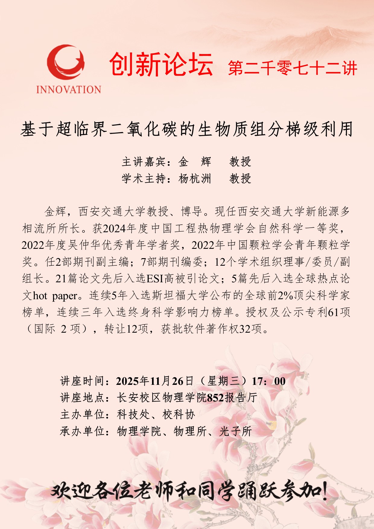 金辉 教授 必赢3003no1线路检测中心创新论坛第二千零七十二讲:基于超临界二氧化碳的生物质组分梯级利用 讲座时间 2025年11月26日(星期三)17:00 讲座地点 长安校区物理学院852报告厅 讲座人介绍 金辉 教授 讲座内容