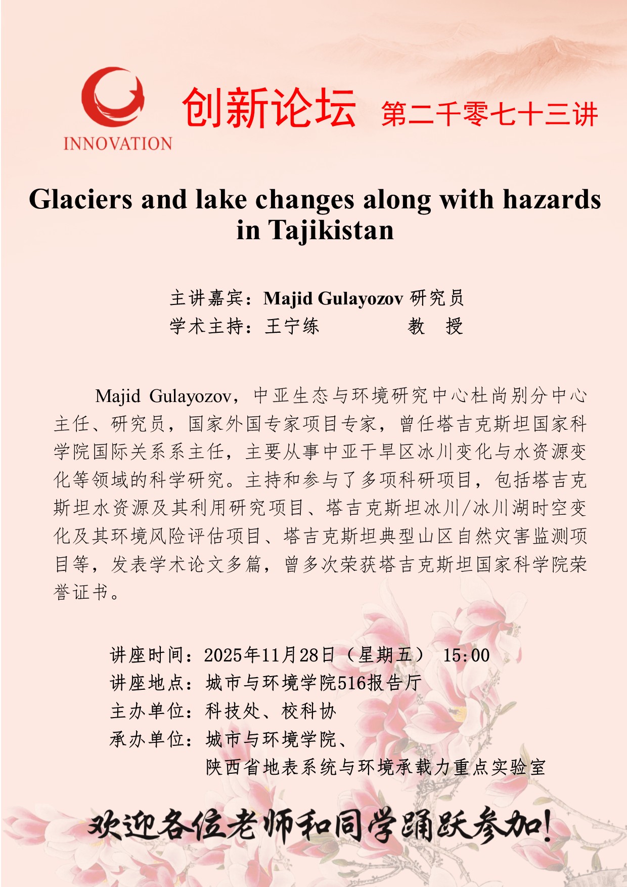 Majid Gulayozov 研究员 必赢3003no1线路检测中心创新论坛第二千零七十三讲:Glaciers and lake changes along with hazards in Tajikistan 讲座时间 2025年11月28日(星期五) 15:00 讲座地点 城市与环境学院516报告厅 讲座人介绍 Majid Gulayozov 研究员 讲座内容