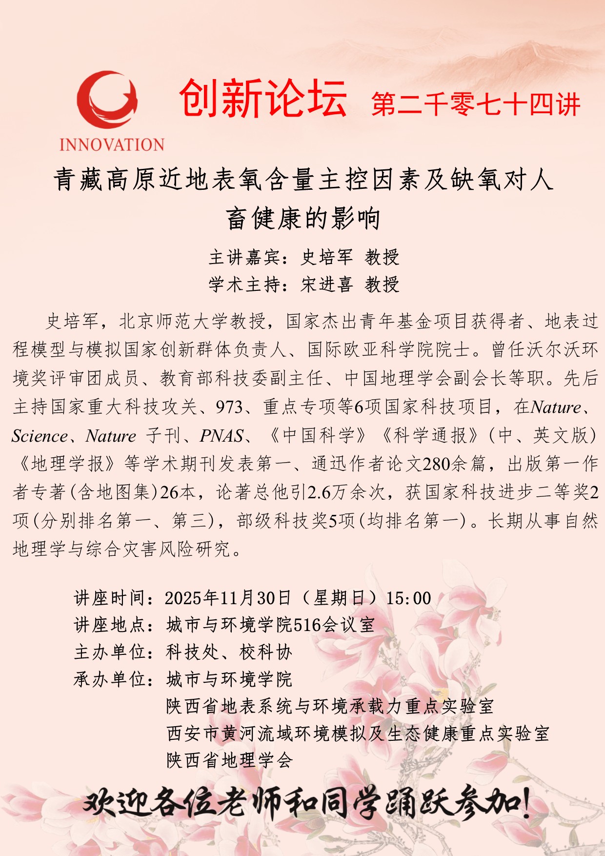 史培军 教授 必赢3003no1线路检测中心创新论坛第二千零七十四讲:青藏高原近地表氧含量主控因素及缺氧对人畜健康的影响 讲座时间 2025年11月30日(星期日)15:00 讲座地点 城市与环境学院516会议室 讲座人介绍 史培军 教授 讲座内容