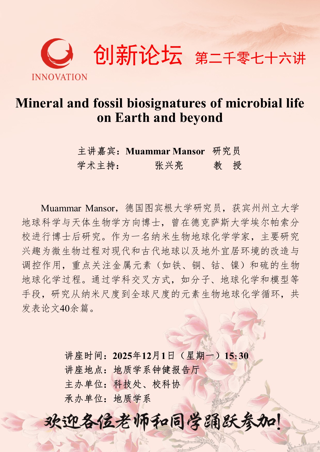 Muammar Mansor 研究员 必赢3003no1线路检测中心创新论坛第二千零七十六讲:Mineral and fossil biosignatures of microbial life on Earth and beyond 讲座时间 2025年12月1日(星期一)15:30 讲座地点 地质学系钟健报告厅 讲座人介绍 Muammar Mansor 研究员 讲座内容