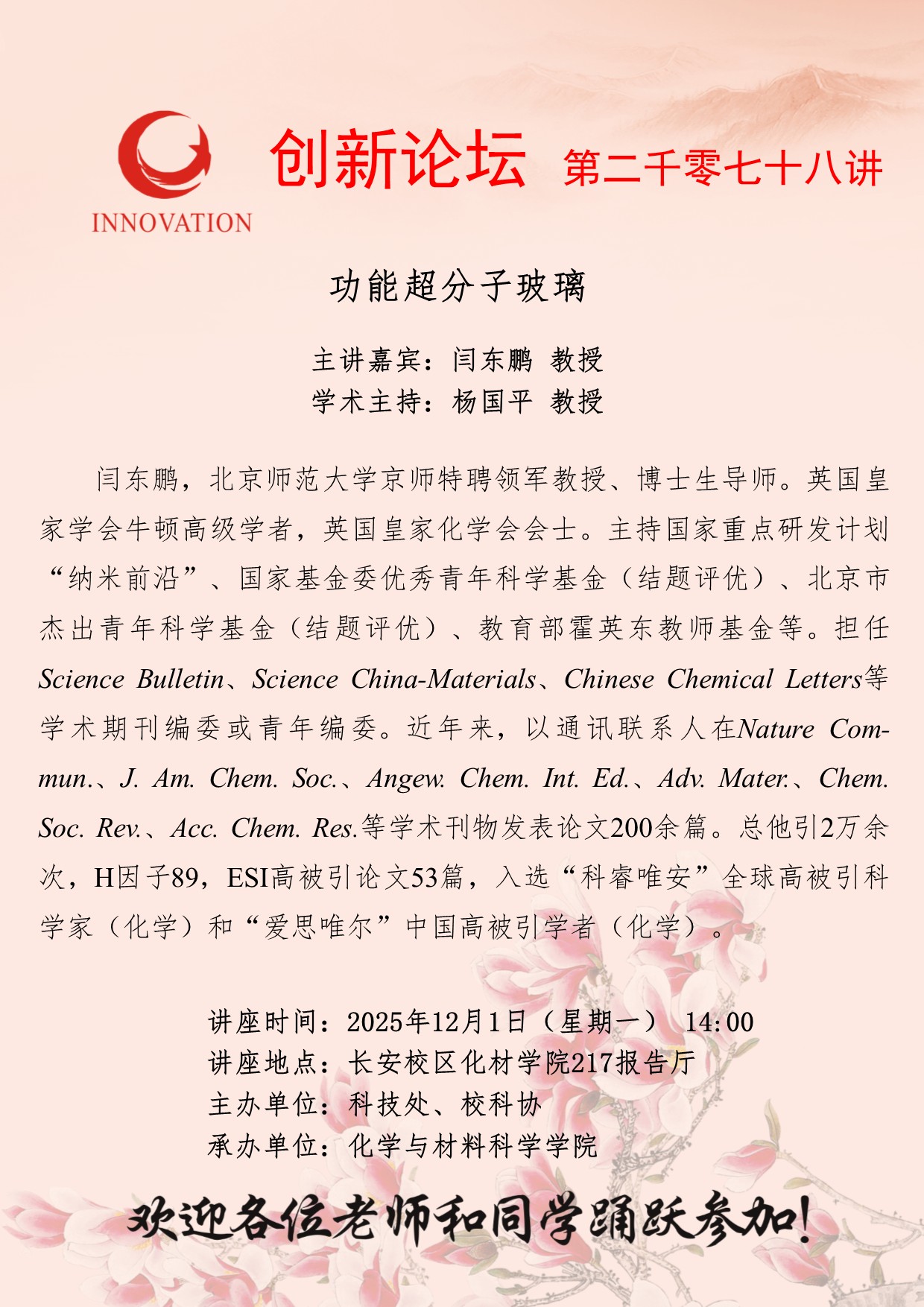 闫东鹏 教授 必赢3003no1线路检测中心创新论坛第二千零七十八讲:功能超分子玻璃 讲座时间 2025年12月1日(星期一) 14:00 讲座地点 长安校区化材学院217报告厅 讲座人介绍 闫东鹏 教授 讲座内容