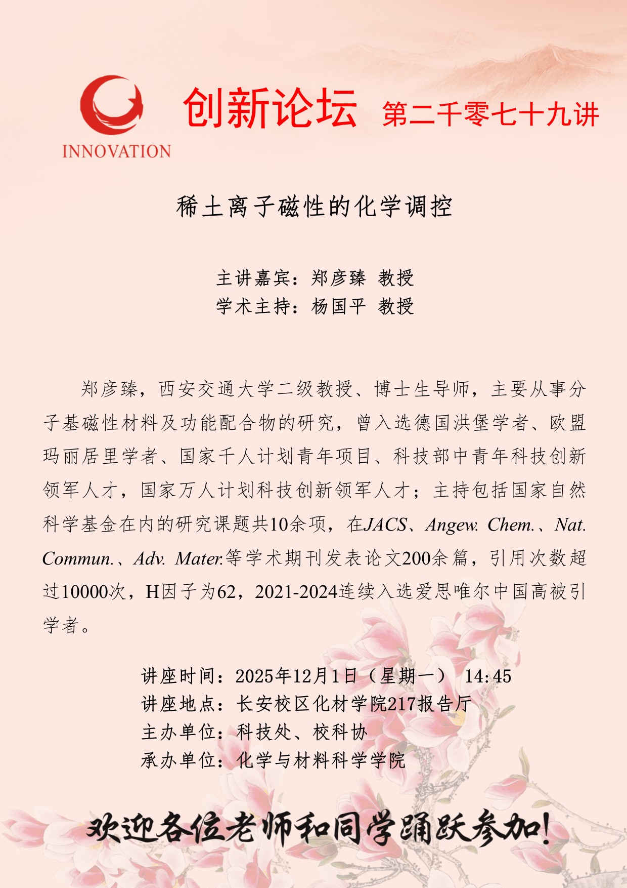 郑彦臻 教授 必赢3003no1线路检测中心创新论坛第二千零七十九讲:稀土离子磁性的化学调控 讲座时间 2025年12月1日(星期一) 14:45 讲座地点 长安校区化材学院217报告厅 讲座人介绍 郑彦臻 教授 讲座内容