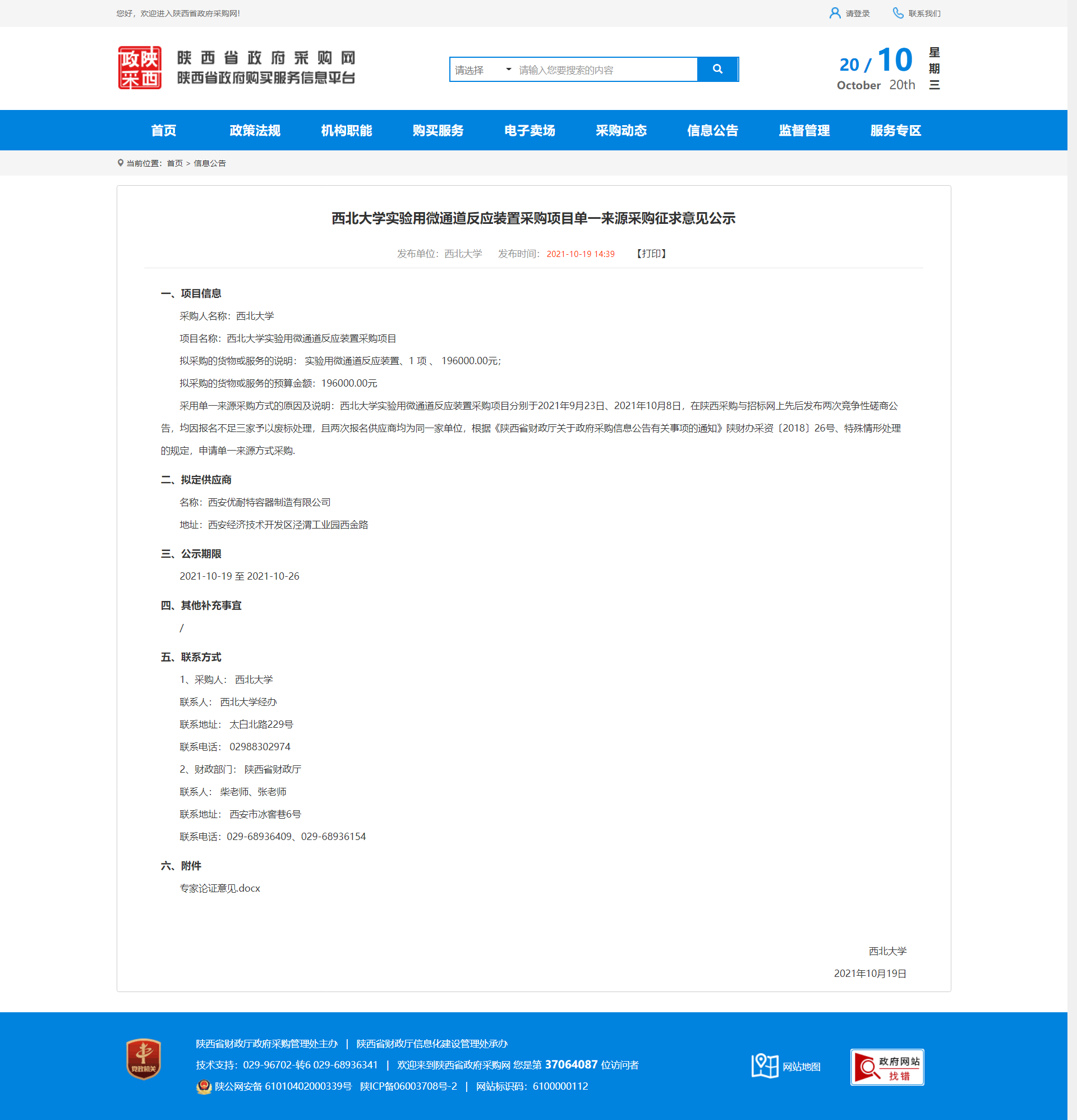 必赢3003no1线路检测中心实验用微通道反应装置采购项目单一来源采购征求意见公示 作者: 编辑:采购与招标办公室 时间:2021-10-20 原公告地址:http://www.ccgp-shaanxi.gov.cn/notice/noticeDetail.do?noticeguid=8a85be337c20d0b4017c97438c3a589e