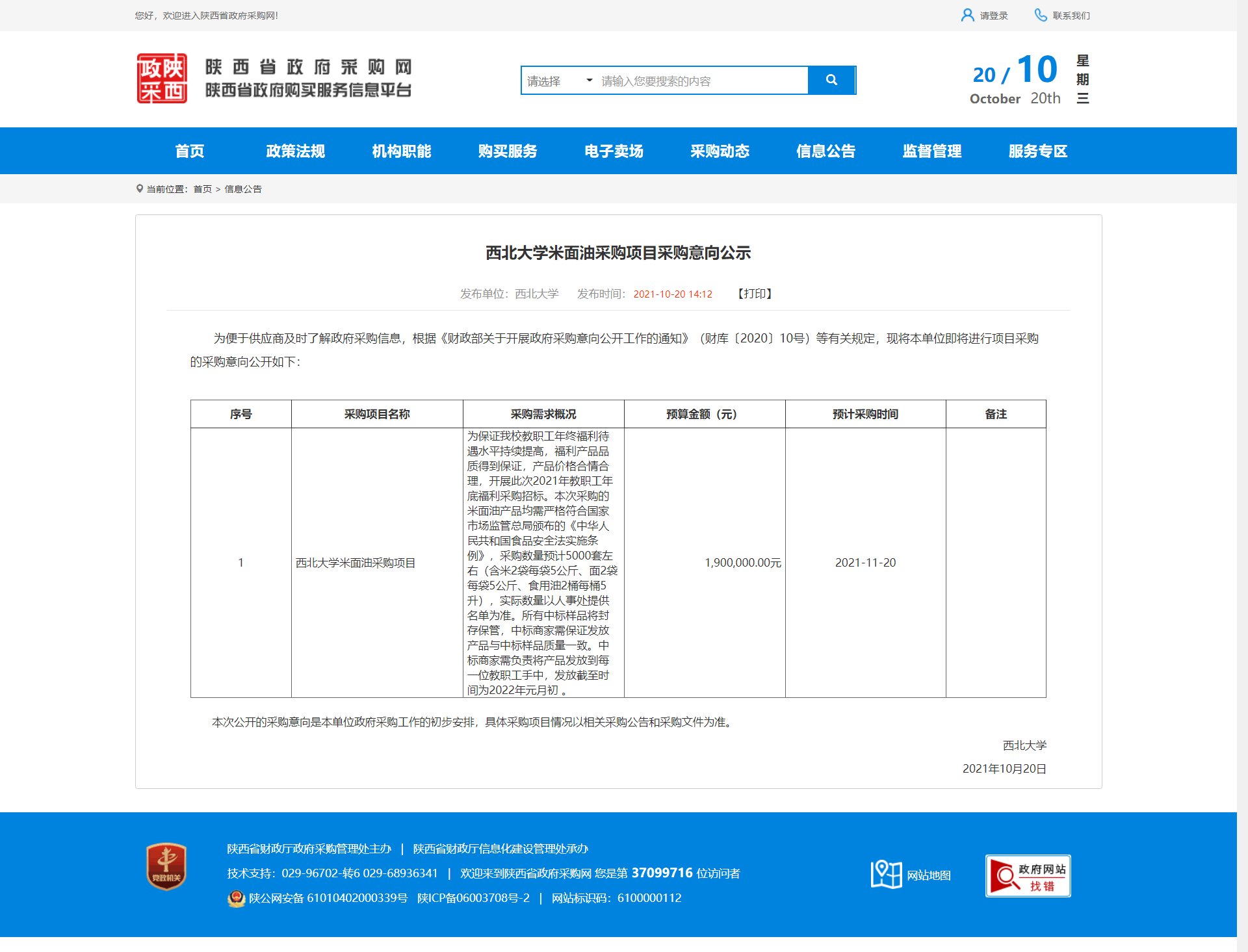 必赢3003no1线路检测中心米面油采购项目采购意向公示 作者: 编辑:采购与招标办公室 时间:2021-10-20 原公告地址:http://www.ccgp-shaanxi.gov.cn/notice/noticeDetail.do?noticeguid=8a85be337c20d0b4017c9c4e47dd0a64