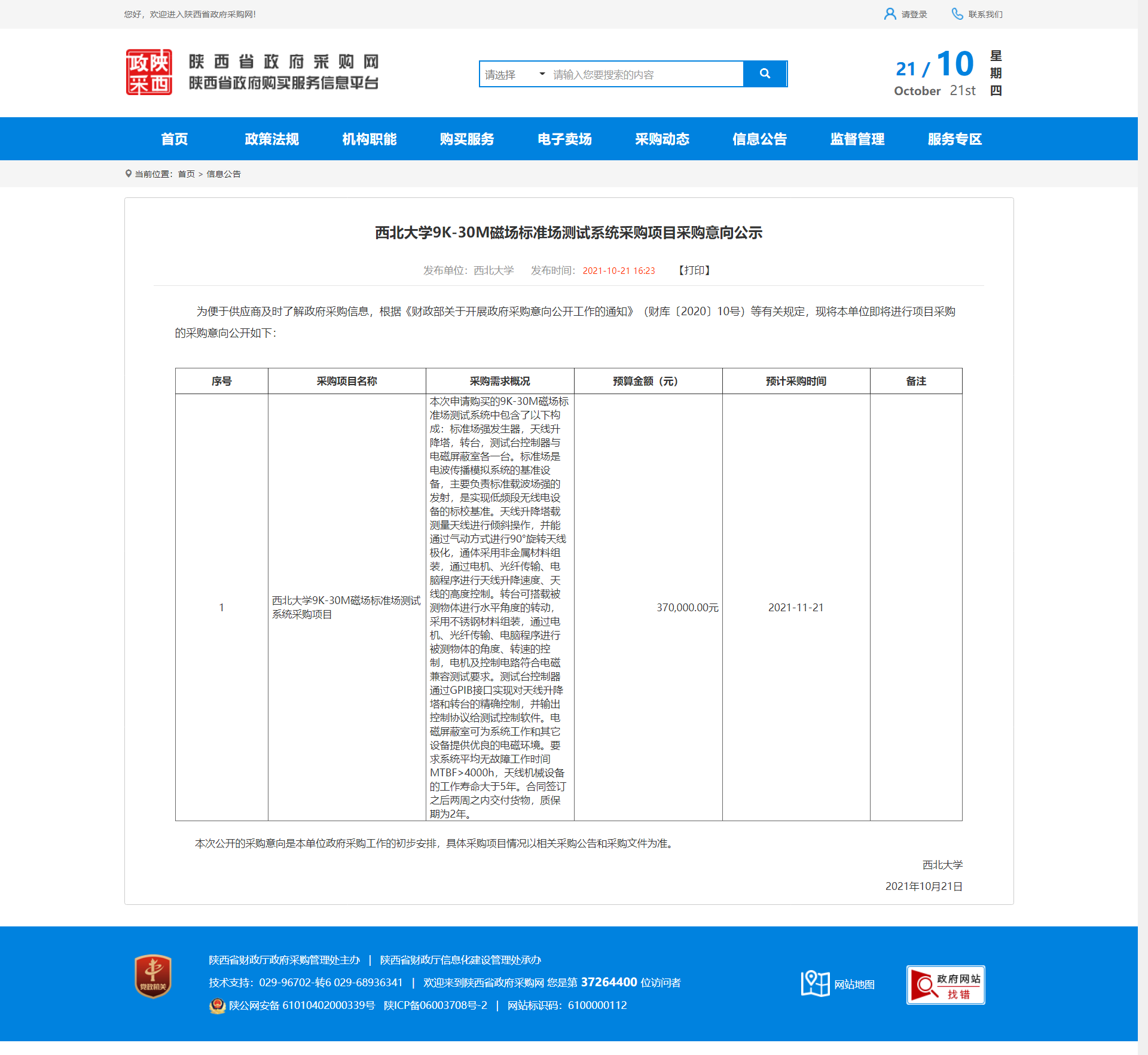 必赢3003no1线路检测中心9K-30M磁场标准场测试系统采购项目采购意向公示 作者: 编辑:采购与招标办公室 时间:2021-10-21 原公告地址:http://ccgp-shaanxi.gov.cn/notice/noticeDetail.do?noticeguid=8a85be337c20d0b4017ca1bd9ec34088