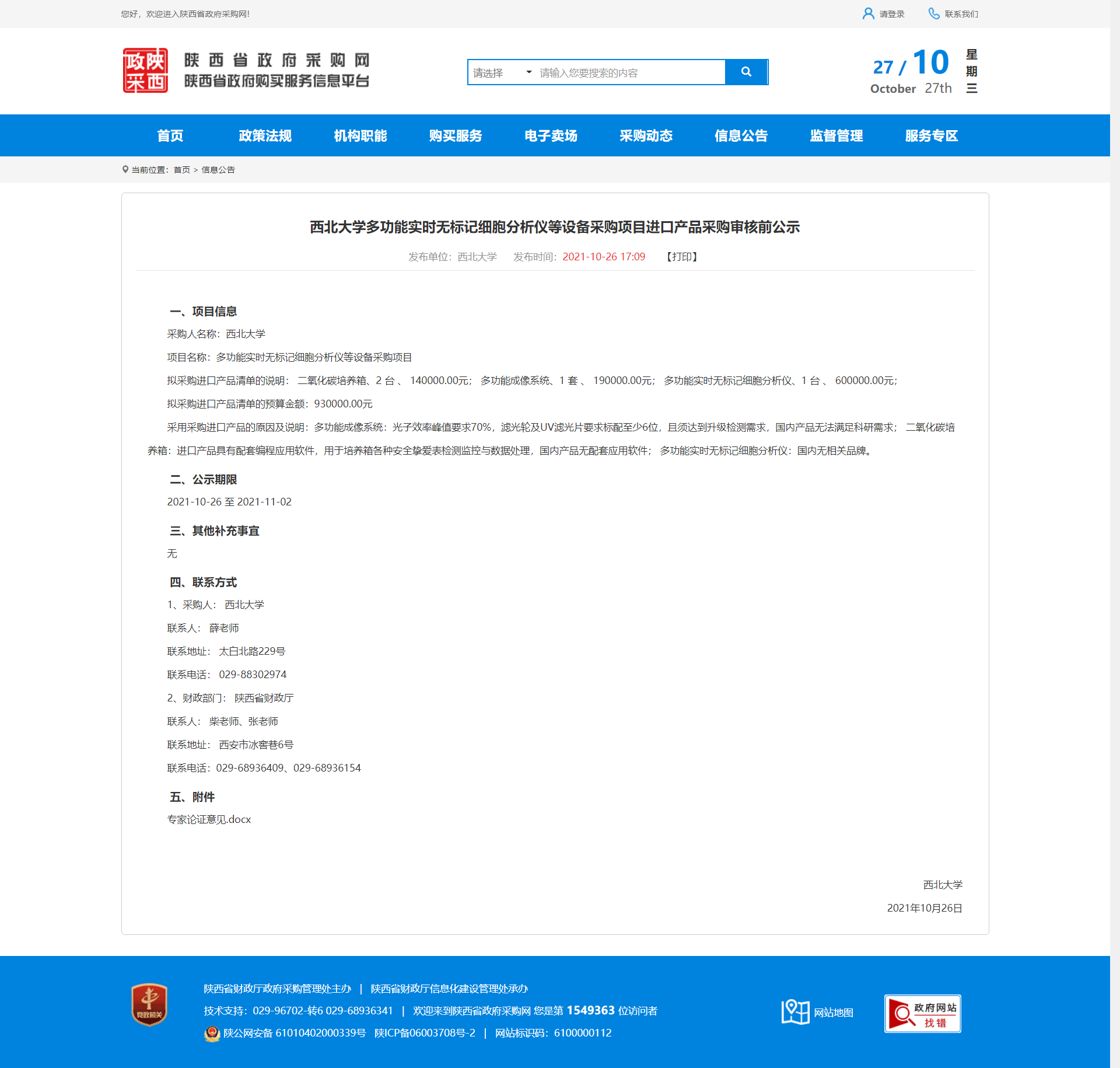 必赢3003no1线路检测中心多功能实时无标记细胞分析仪等设备采购项目进口产品采购审核前公示 作者: 编辑:薛利娟 时间:2021-10-27 原公告地址:http://www.ccgp-shaanxi.gov.cn/notice/noticeDetail.do?noticeguid=8a85be337c20d0b4017cbbbd74c45f9b
