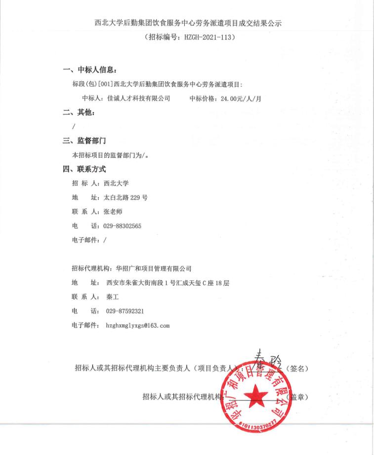 关于必赢3003no1线路检测中心后勤集团饮食服务中心劳务派遣项目成交结果公告