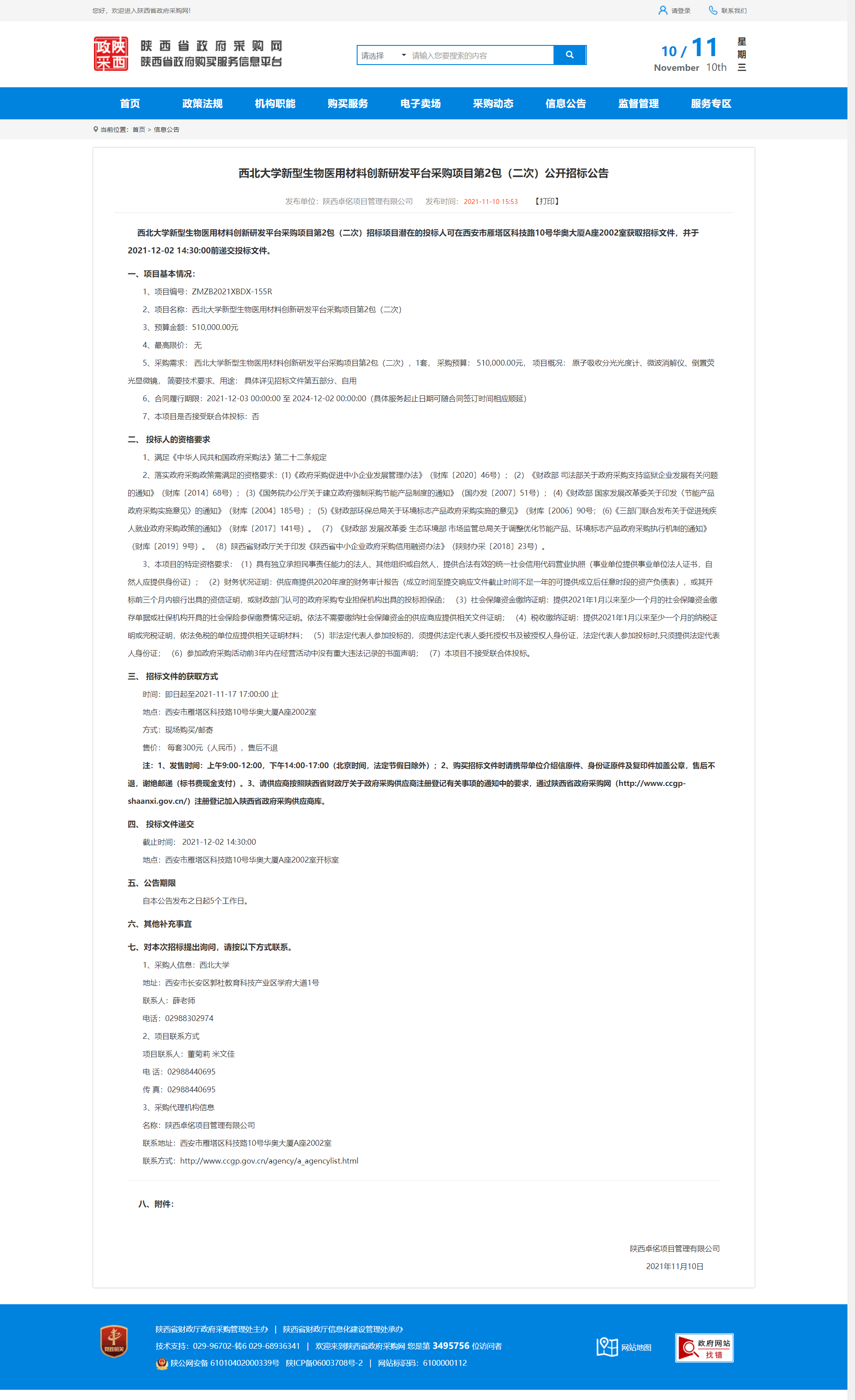 必赢3003no1线路检测中心新型生物医用材料创新研发平台采购项目第2包(二次)公开招标公告 作者: 编辑:薛利娟 时间:2021-11-10 原公告网址:http://www.ccgp-shaanxi.gov.cn/notice/noticeDetail.do?noticeguid=8a85be347cefc0a5017d07ed8f131470