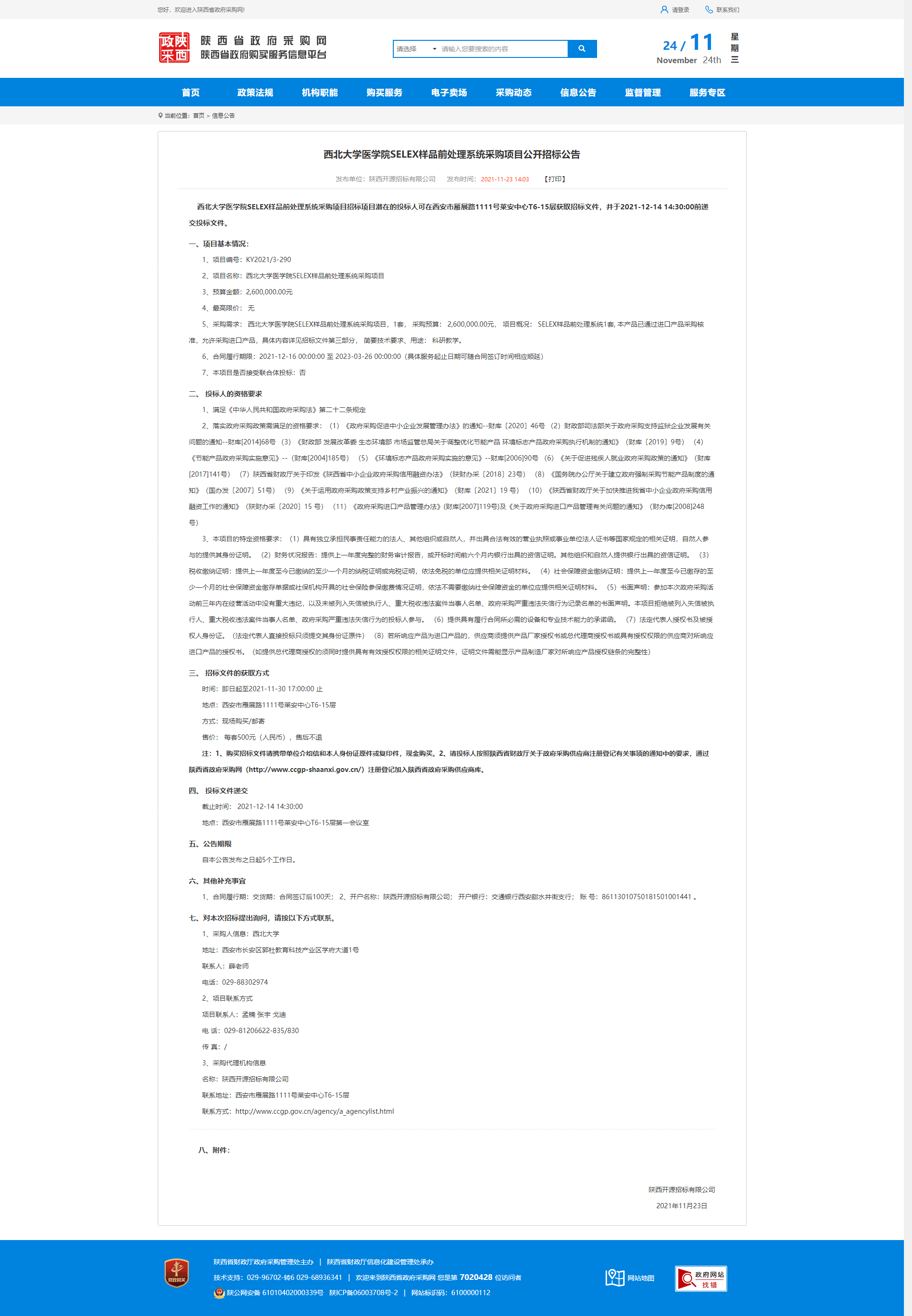 必赢3003no1线路检测中心医学院SELEX样品前处理系统采购项目公开招标公告 作者: 编辑:薛利娟 时间:2021-11-24 原公告网址:http://www.ccgp-shaanxi.gov.cn/notice/noticeDetail.do?noticeguid=8a85be327d2d74ab017d4b5ce2de36ff
