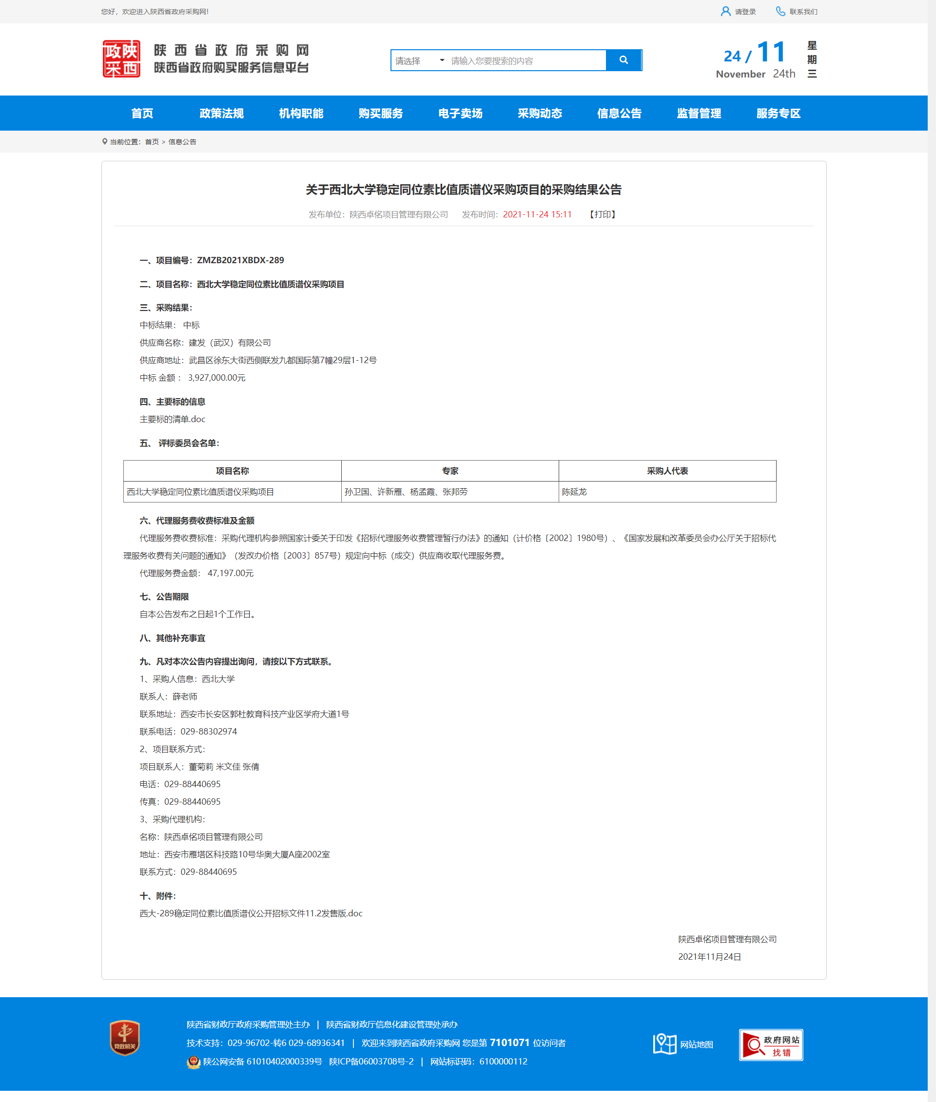 关于必赢3003no1线路检测中心稳定同位素比值质谱仪采购项目的采购结果公告 作者: 编辑:薛利娟 时间:2021-11-24 原公告网址:http://www.ccgp-shaanxi.gov.cn/notice/noticeDetail.do?noticeguid=8a85be347d2d6f8d017d50c513e326e6
