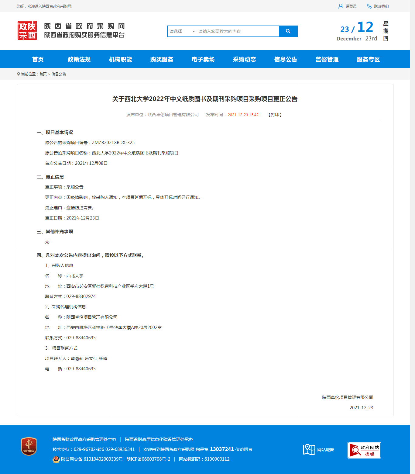 关于必赢3003no1线路检测中心2022年中文纸质图书及期刊采购项目采购项目更正公告 作者: 编辑:薛利娟 时间:2021-12-23 原公告链接:http://www.ccgp-shaanxi.gov.cn/notice/noticeDetail.do?noticeguid=8a85be327dace5d8017de63c777e2f27