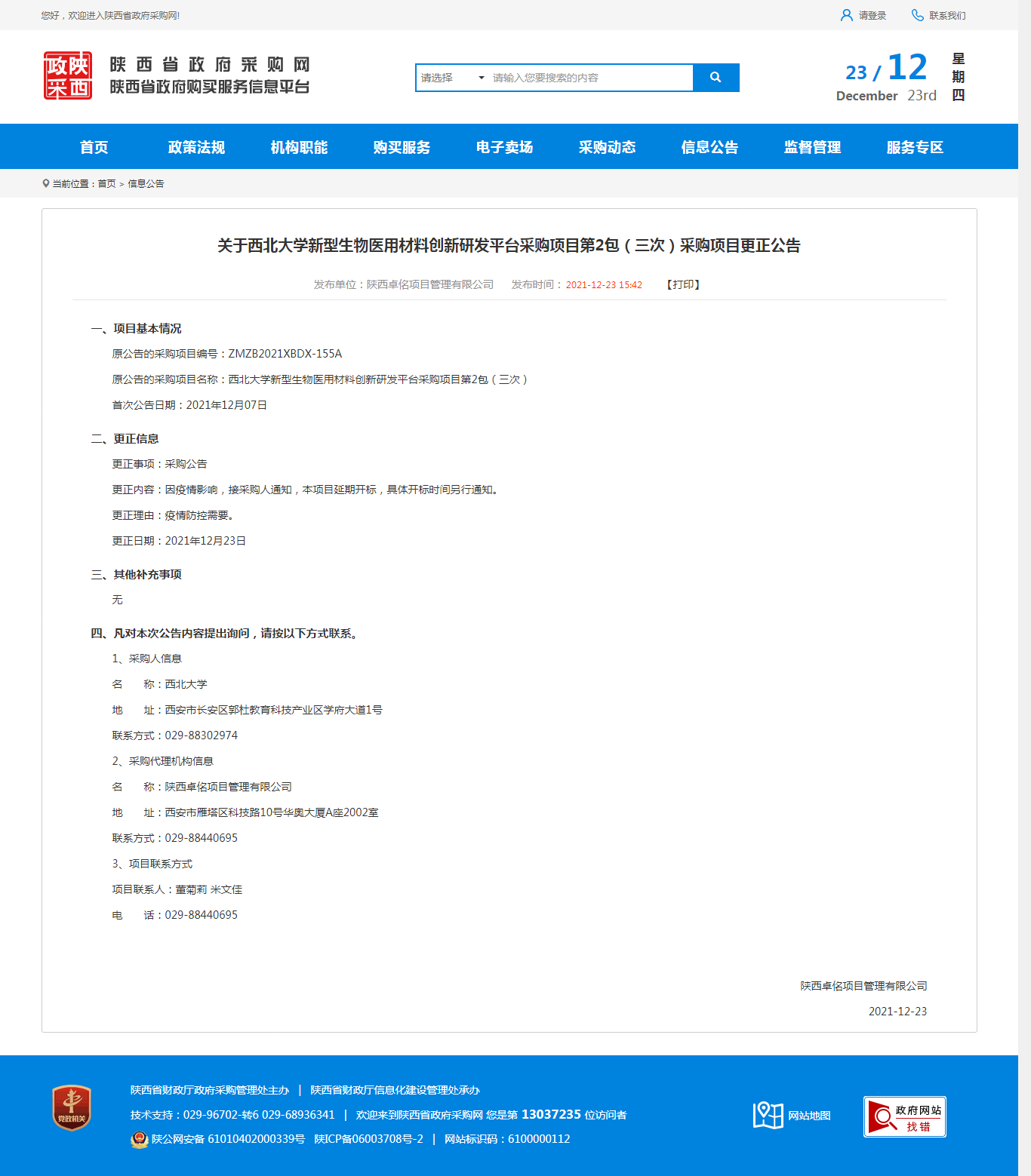 关于必赢3003no1线路检测中心新型生物医用材料创新研发平台采购项目第2包(三次)采购项目更正公告 作者: 编辑:薛利娟 时间:2021-12-23 原公告链接:http://www.ccgp-shaanxi.gov.cn/notice/noticeDetail.do?noticeguid=8a85be327dace5d8017de63b467e2efd