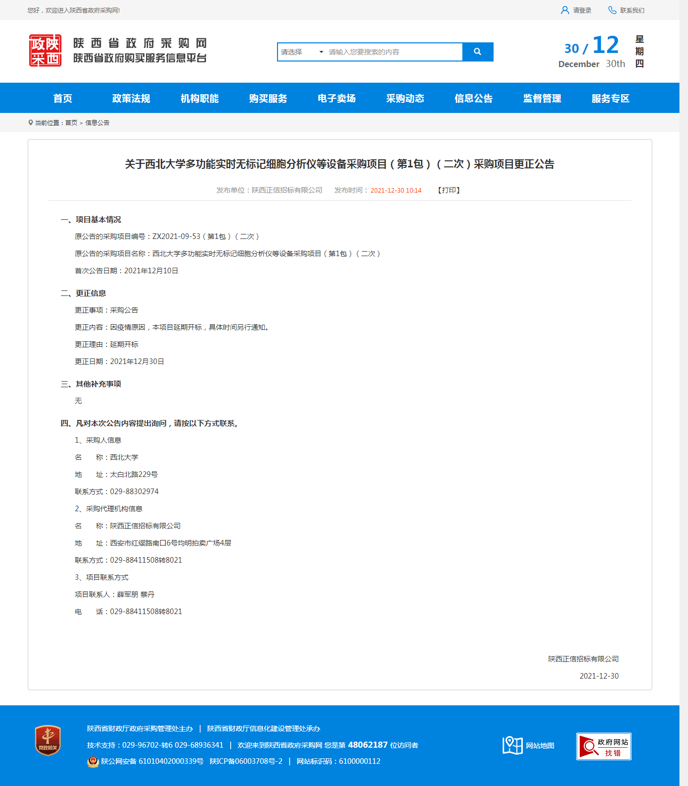关于必赢3003no1线路检测中心多功能实时无标记细胞分析仪等设备采购项目(第1包)(二次)采购项目更正公告 作者: 编辑:薛利娟 时间:2021-12-30 原公告链接:http://www.ccgp-shaanxi.gov.cn/notice/noticeDetail.do?noticeguid=8a85be337debad6b017e09039d8453ea