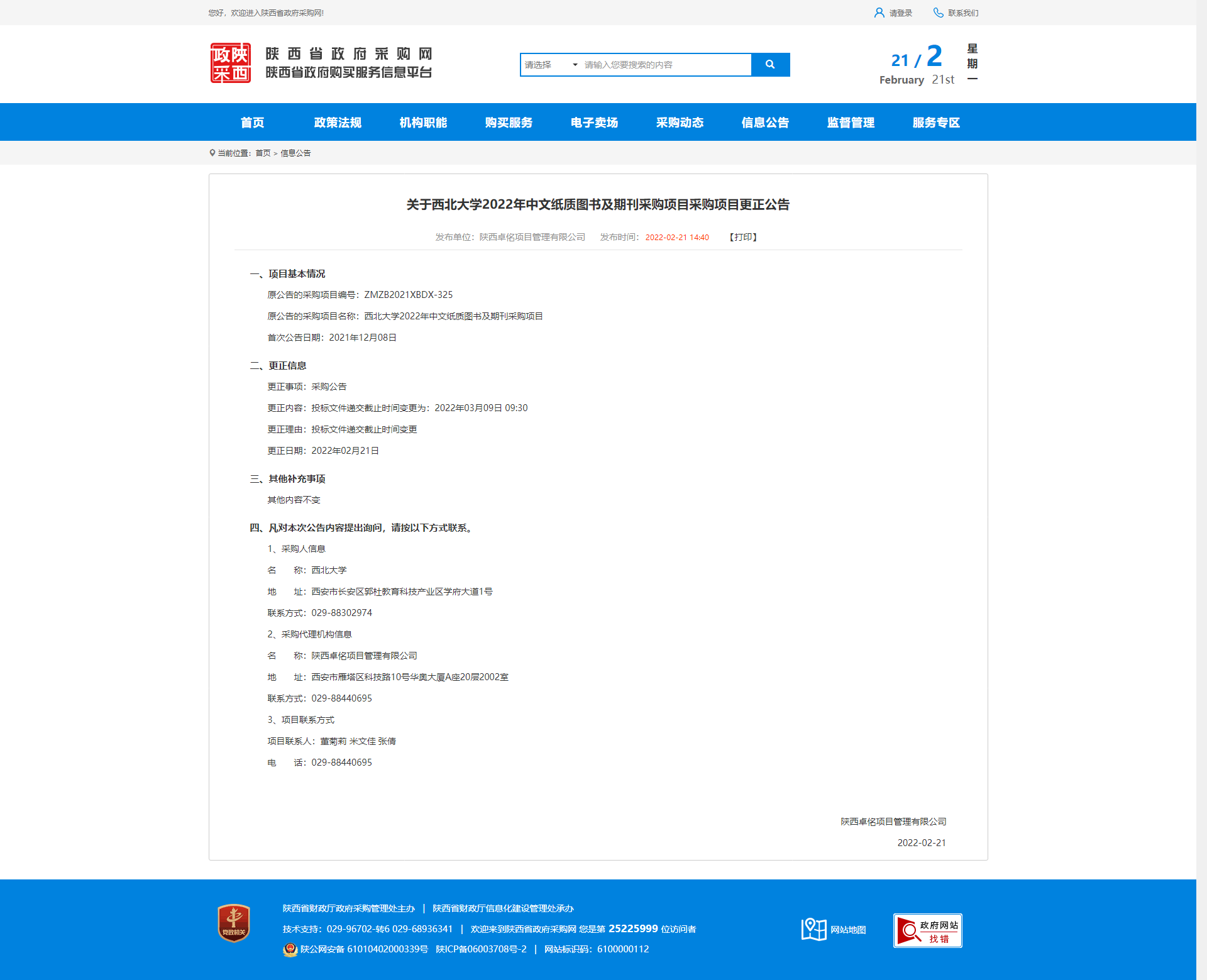 关于必赢3003no1线路检测中心2022年中文纸质图书及期刊采购项目采购项目更正公告 作者: 编辑:薛利娟 时间:2022-02-21 原公告地址:http://www.ccgp-shaanxi.gov.cn/notice/noticeDetail.do?noticeguid=8a85be317ee7907d017f1aa113f346e8