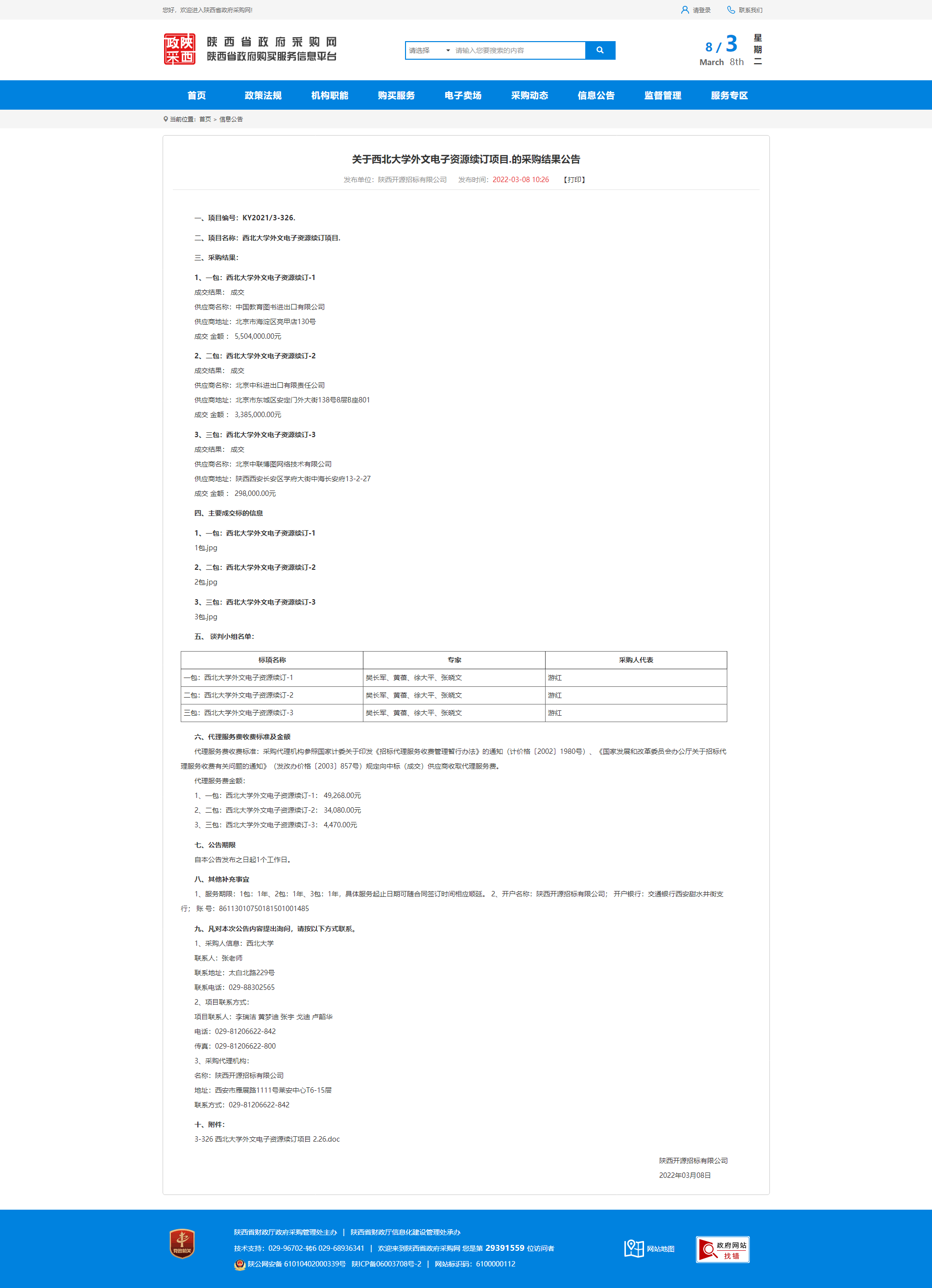 关于必赢3003no1线路检测中心外文电子资源续订项目的采购结果公告