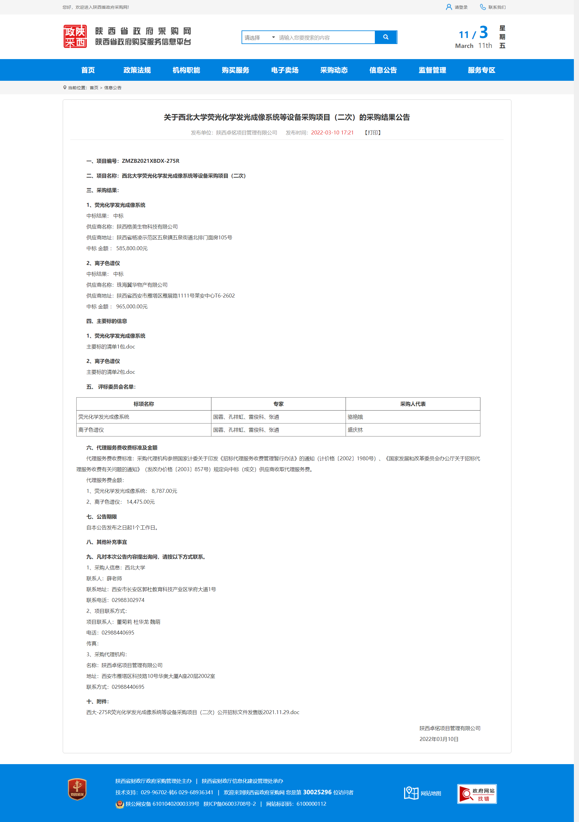 关于必赢3003no1线路检测中心荧光化学发光成像系统等设备采购项目(二次)的采购结果公告 作者: 编辑:薛利娟 时间:2022-03-11 原公告链接:http://www.ccgp-shaanxi.gov.cn/notice/noticeDetail.do?noticeguid=8a85be327f3fe30d017f7320415845ab