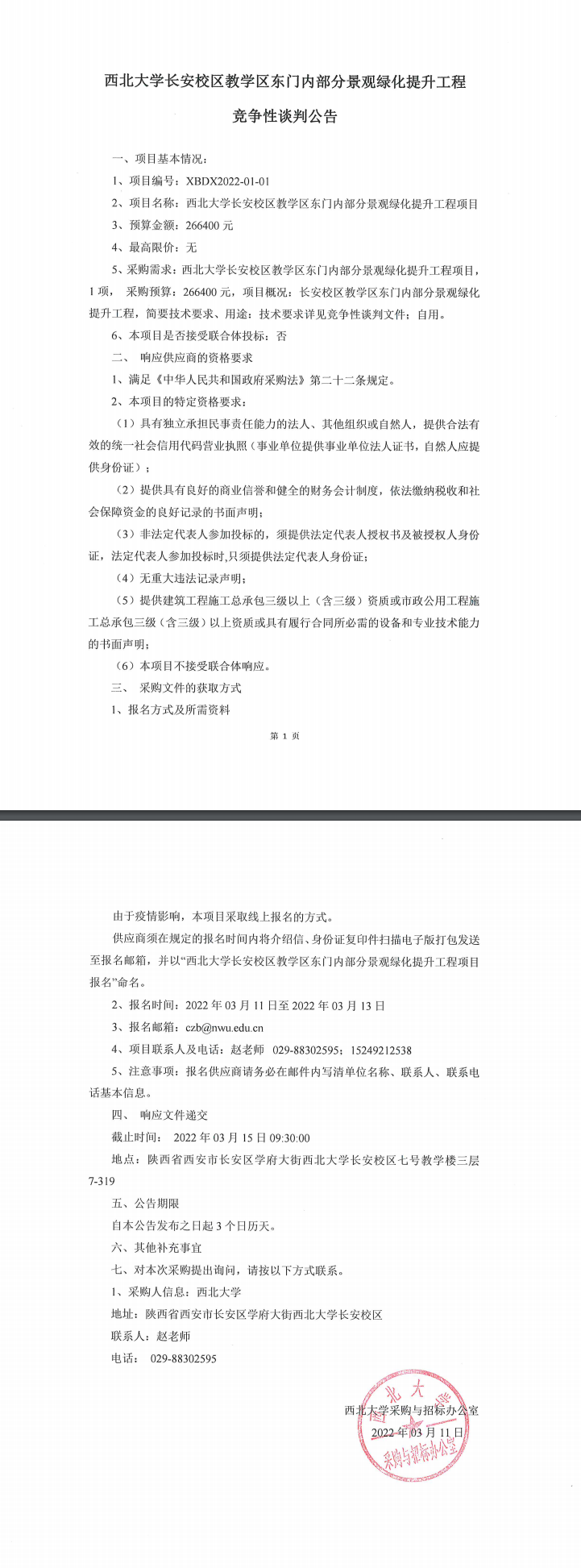 必赢3003no1线路检测中心长安校区教学区东门内部分景观绿化提升工程竞争性谈判公告