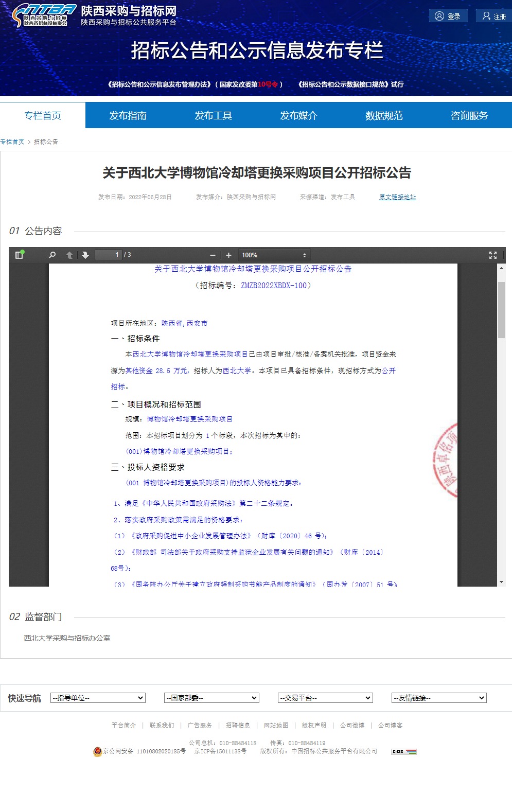 关于必赢3003no1线路检测中心博物馆冷却塔更换采购项目公开招标公告 作者: 编辑:采购与招标办公室 时间:2022-06-28 原公告链接:http://bulletin.sntba.com/biddingBulletin/2022-06-28/439809.html