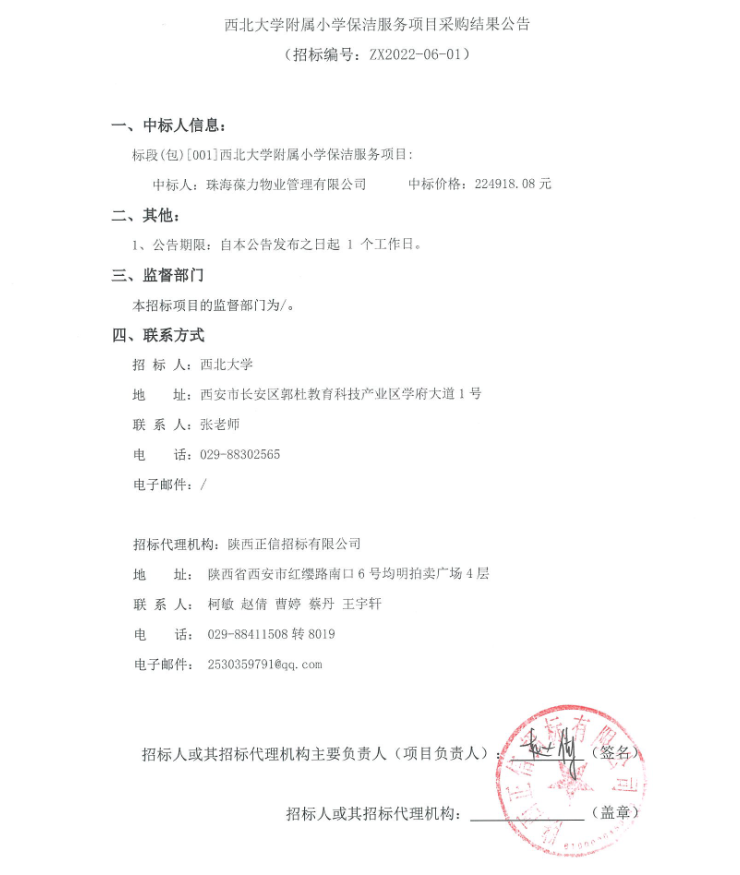关于必赢3003no1线路检测中心附属小学保洁服务项目采购结果公告