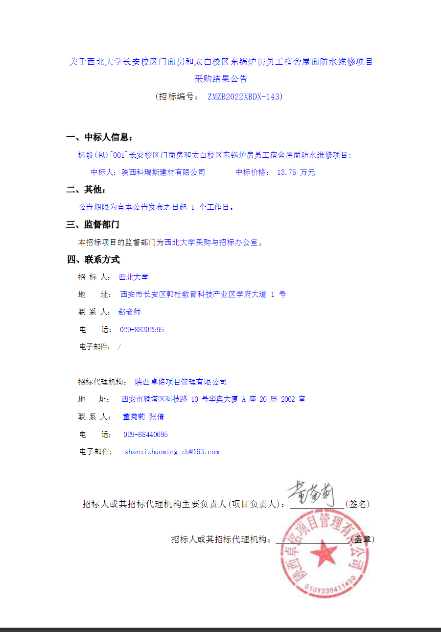 关于必赢3003no1线路检测中心长安校区门面房和太白校区东锅炉房员工宿舍屋面防水维修项目采购结果公告