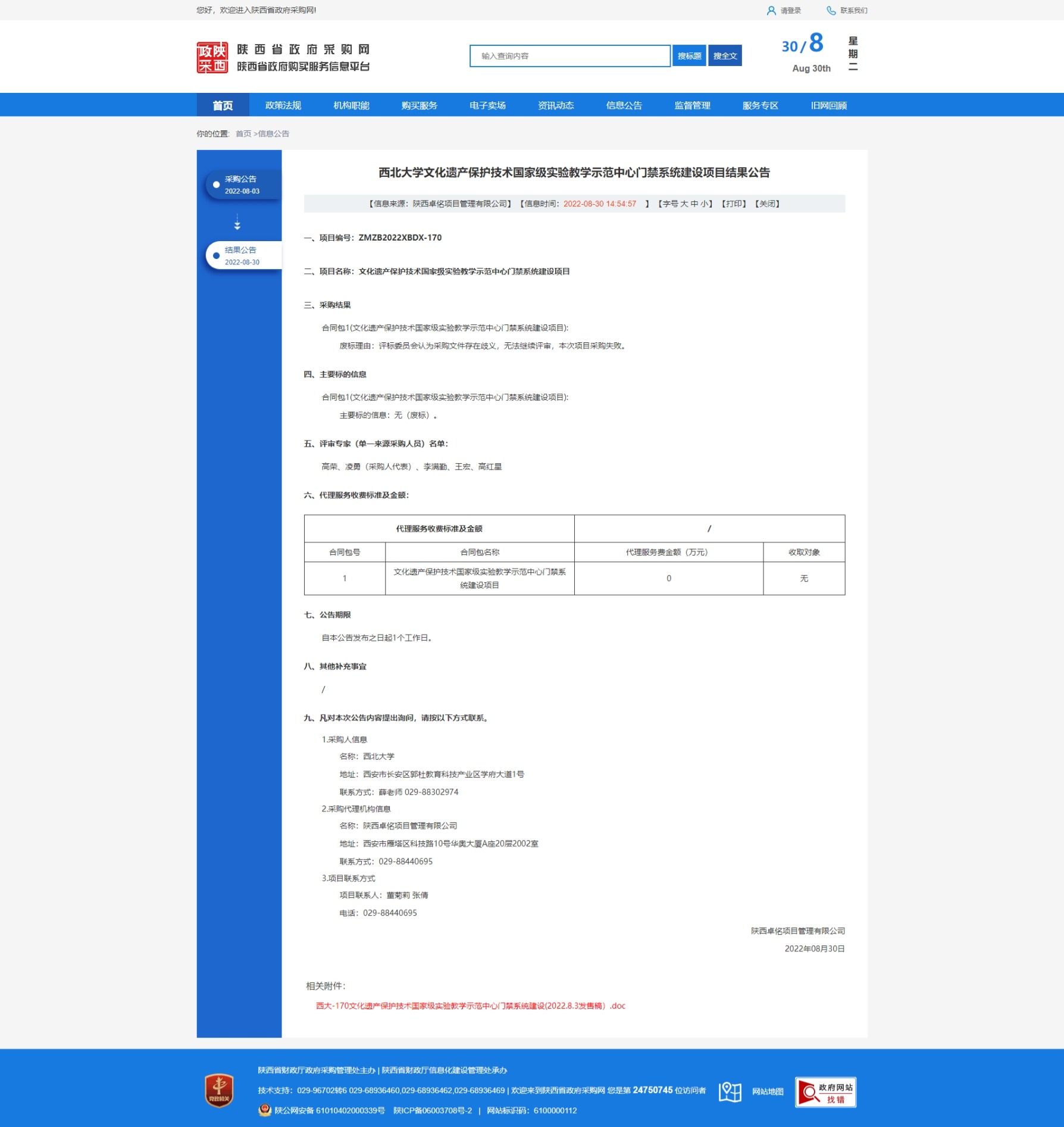必赢3003no1线路检测中心文化遗产保护技术国家级实验教学示范中心门禁系统建设项目结果公告 作者: 编辑: 时间:2022-08-30 原公告链接:http://www.ccgp-shaanxi.gov.cn/freecms/site/shaanxi/ggxx/info/2022/8a69c59682a320a40182ed7d58d93426.html?noticeType=001006¬iceId=225c2bea-2831-11ed-9a8e-08c0eb20c666