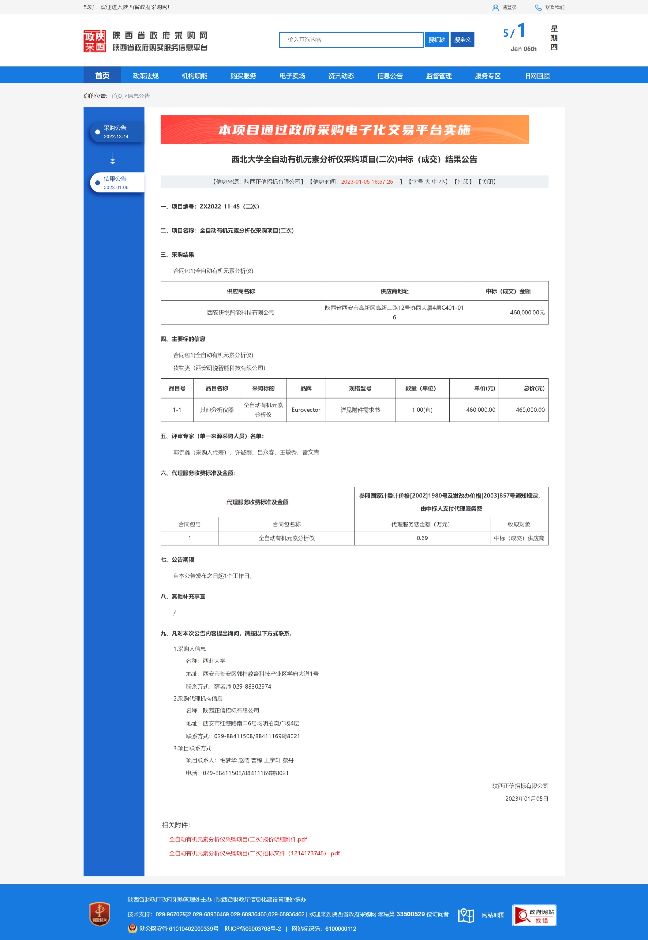 必赢3003no1线路检测中心全自动有机元素分析仪采购项目(二次)中标(成交)结果公告 作者: 编辑:采购与招标办公室 时间:2023-01-05 原公告链接:http://www.ccgp-shaanxi.gov.cn/freecms/site/shaanxi/ggxx/info/2023/8a69c86f852dbe9b0185807f572a04d1.html?noticeType=001021¬iceId=b8ed0ed9-8cd7-11ed-9a8e-08c0eb20c666