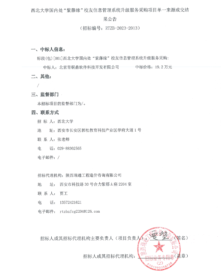 必赢3003no1线路检测中心国内处“紫藤缘”校友信息管理系统升级服务采购项目单一来源成交结果公告