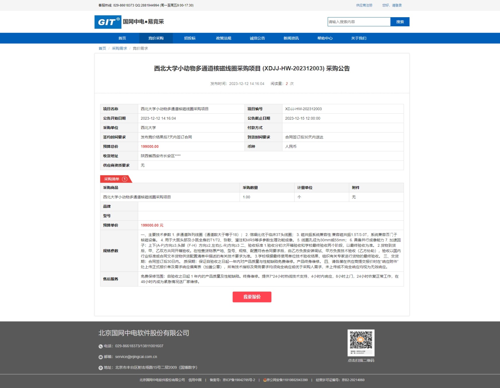 必赢3003no1线路检测中心小动物多通道核磁线圈采购项目 (XDJJ-HW-202312003) 采购公告 作者: 编辑: 时间:2023-12-12 原公告链接:https://www.ejingcai.com.cn/site/bidding/detail/7761