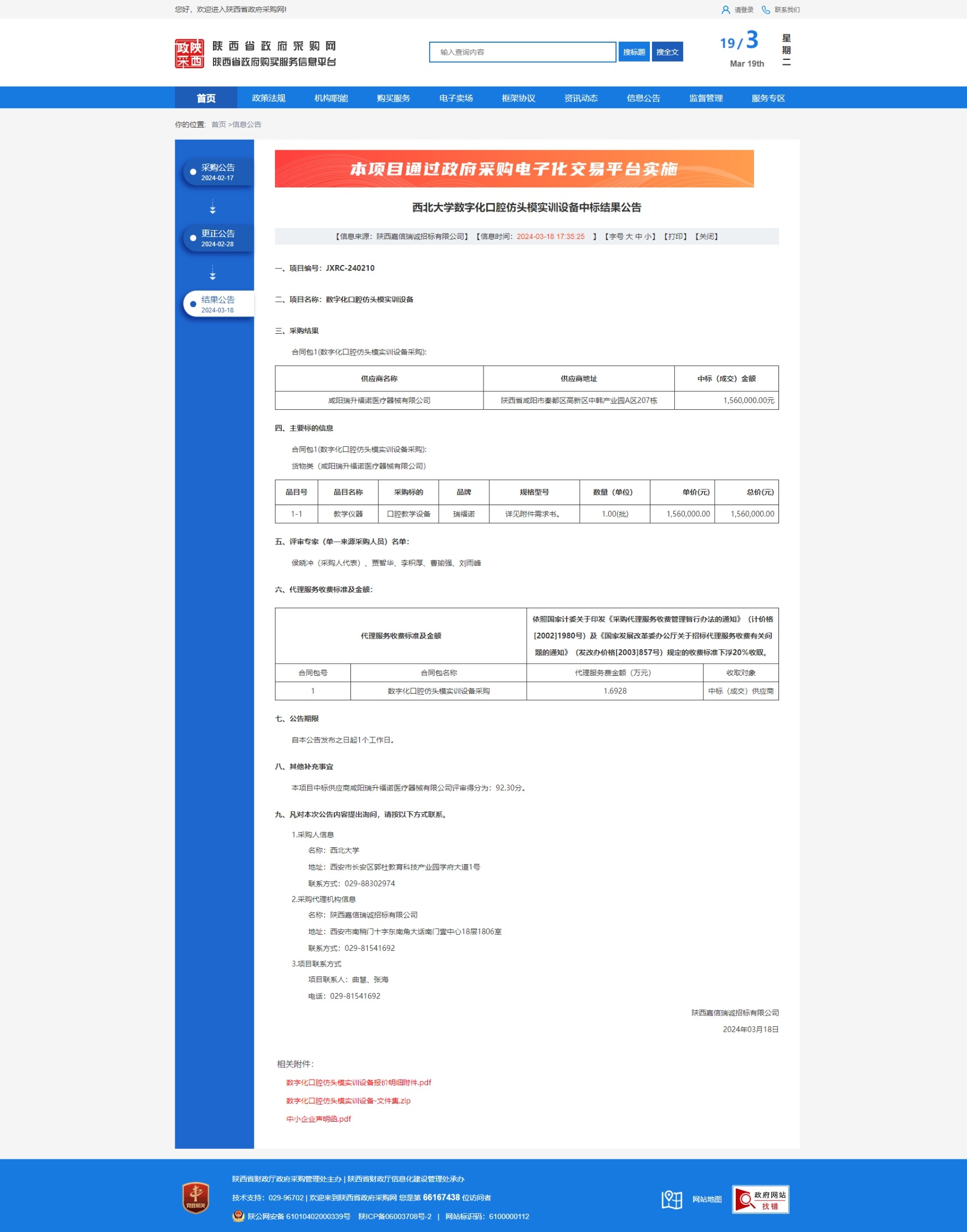 必赢3003no1线路检测中心数字化口腔仿头模实训设备中标结果公告 作者: 编辑:采购与招标办公室 时间:2024-03-19 原公告链接:https://www.ccgp-shaanxi.gov.cn/freecms/site/shaanxi/ggxx/info/2024/8a69c7f58e463d37018e50cd061a2aef.html?noticeType=001021¬iceId=fbf978e2-e50b-11ee-b8b6-08c0eb20c666