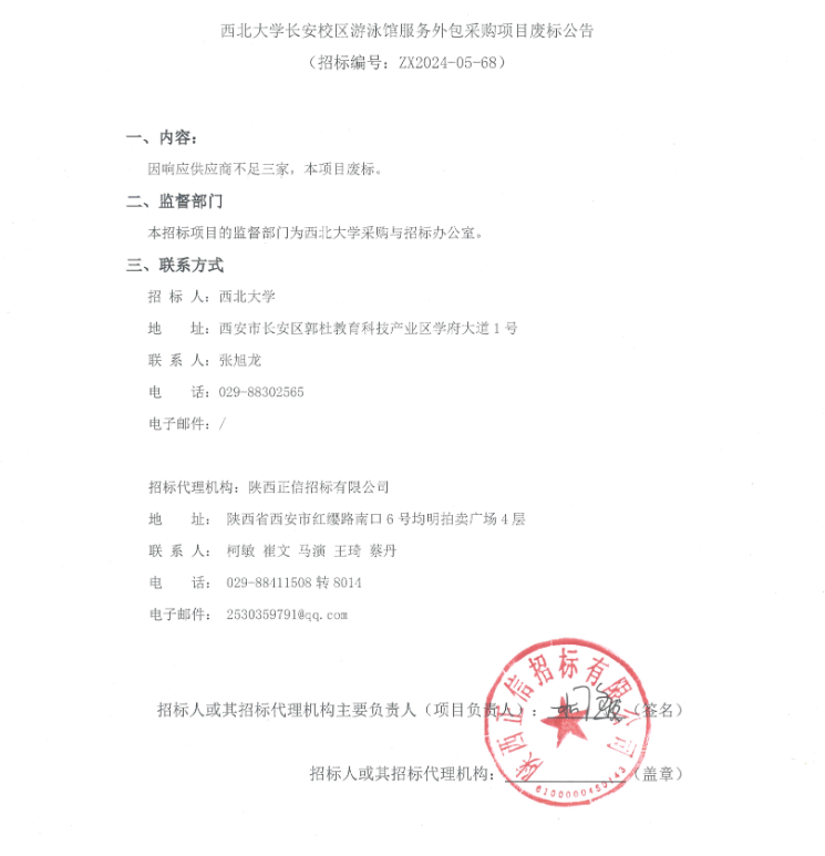 必赢3003no1线路检测中心长安校区游泳馆服务外包采购项目废标公告