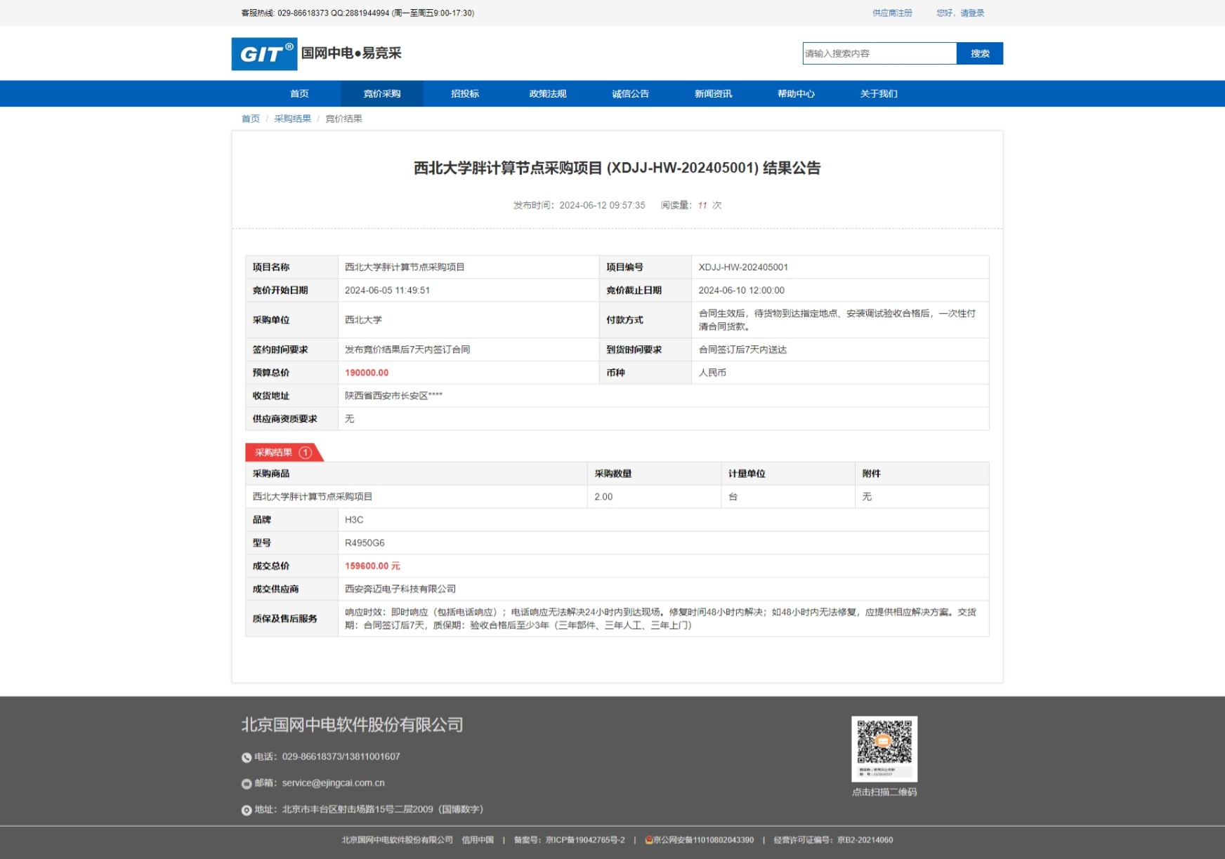 必赢3003no1线路检测中心胖计算节点采购项目 (XDJJ-HW-202405001)竞价结果公告 作者: 编辑:采购与招标办公室 时间:2024-06-12 原公告链接:https://www.ejingcai.com.cn/site/bidding/detail/10930