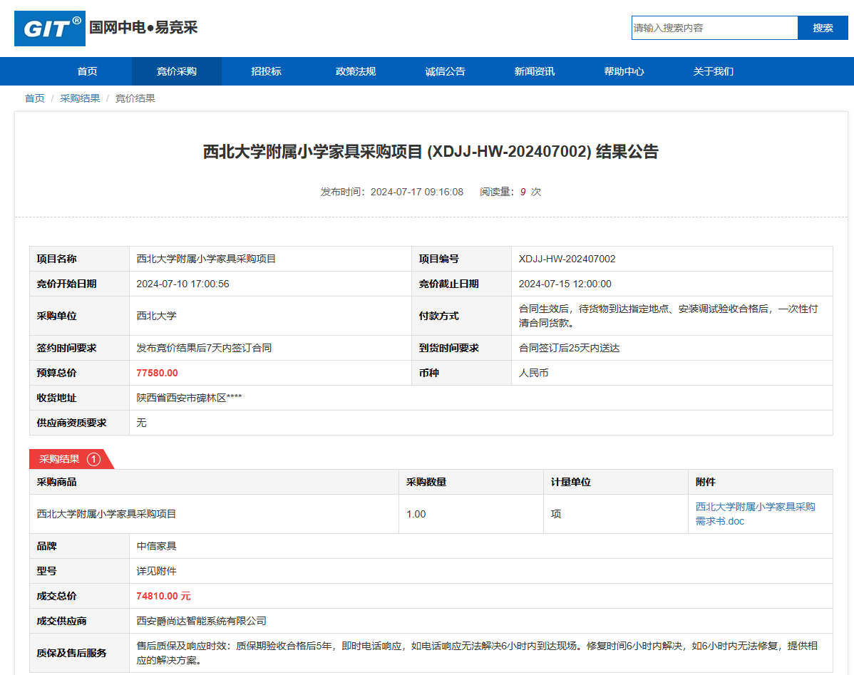 必赢3003no1线路检测中心附属小学家具采购项目 (XDJJ-HW-202407002) 竞价结果公告 作者: 编辑: 时间:2024-07-17 原公告链接:https://www.ejingcai.com.cn/site/bidding/detail/11713
