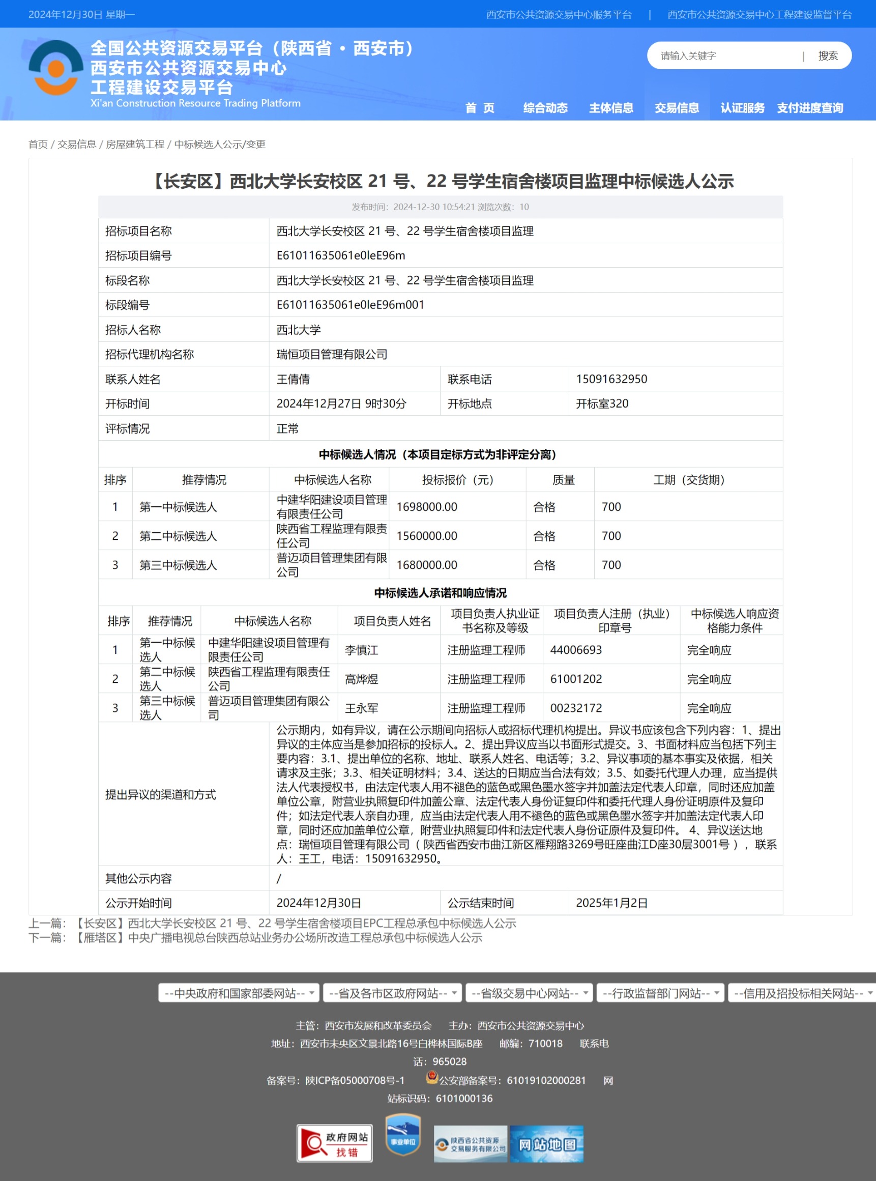必赢3003no1线路检测中心长安校区 21 号、22 号学生宿舍楼项目监理中标候选人公示