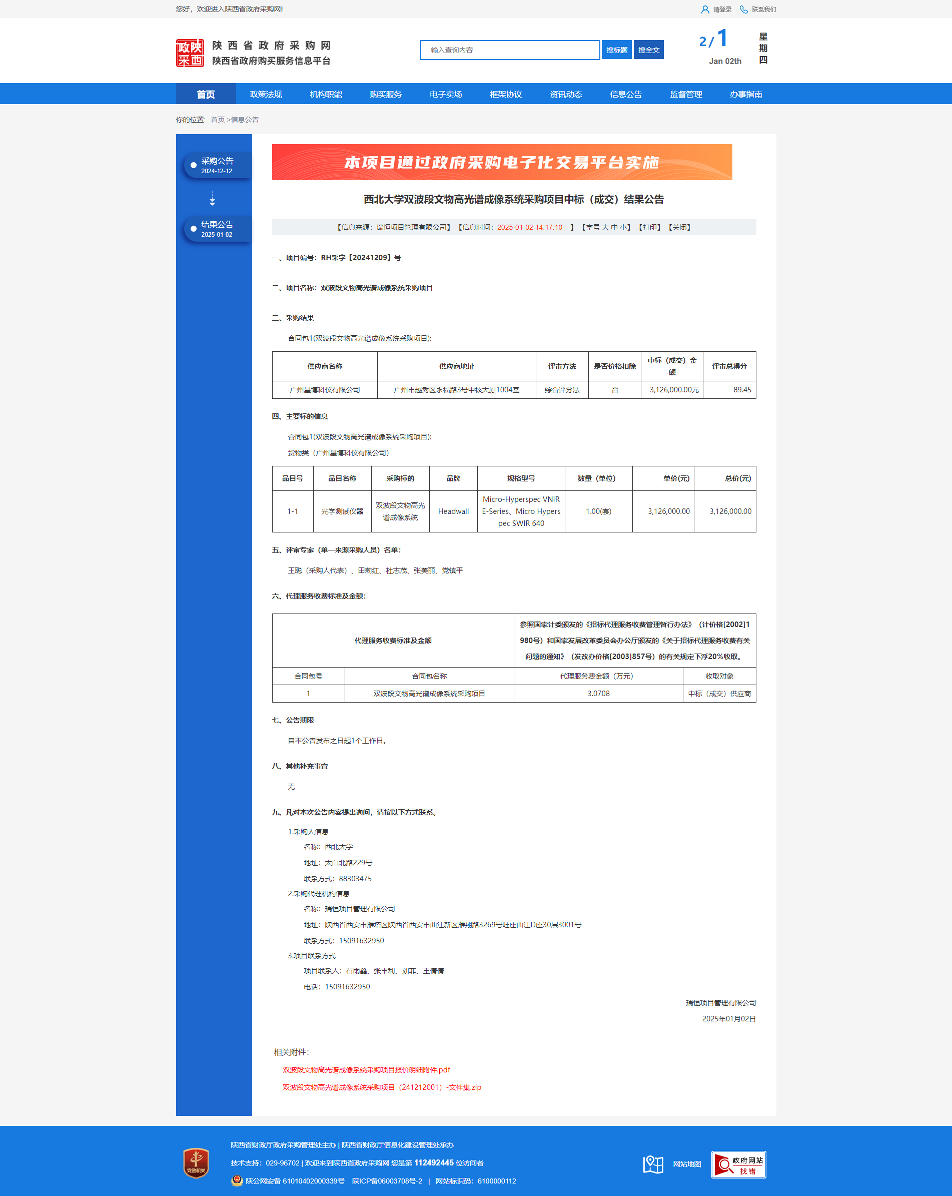 必赢3003no1线路检测中心双波段文物高光谱成像系统采购项目中标(成交)结果公告