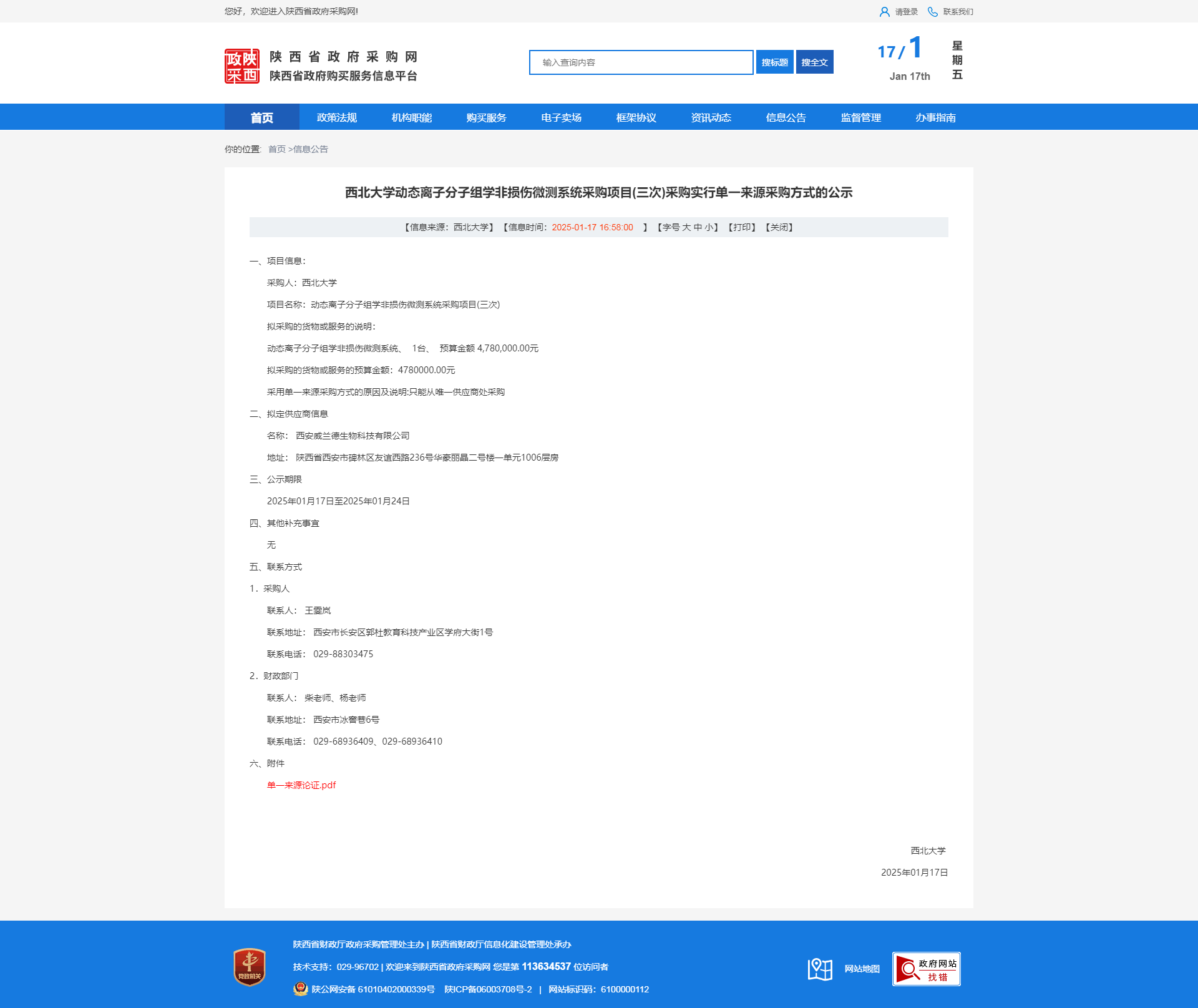 必赢3003no1线路检测中心动态离子分子组学非损伤微测系统采购项目(三次)采购实行单一来源采购方式的公示 作者:采购与招标办公室 编辑: 时间:2025-01-18 原公告链接:http://www.ccgp-shaanxi.gov.cn/freecms/site/shaanxi/ggxx/info/2025/8a69c617941d4b230194736c2f3223ec.html?noticeType=001051¬iceId=d735ebaf-d4b2-11ef-8063-08c0eb20c666