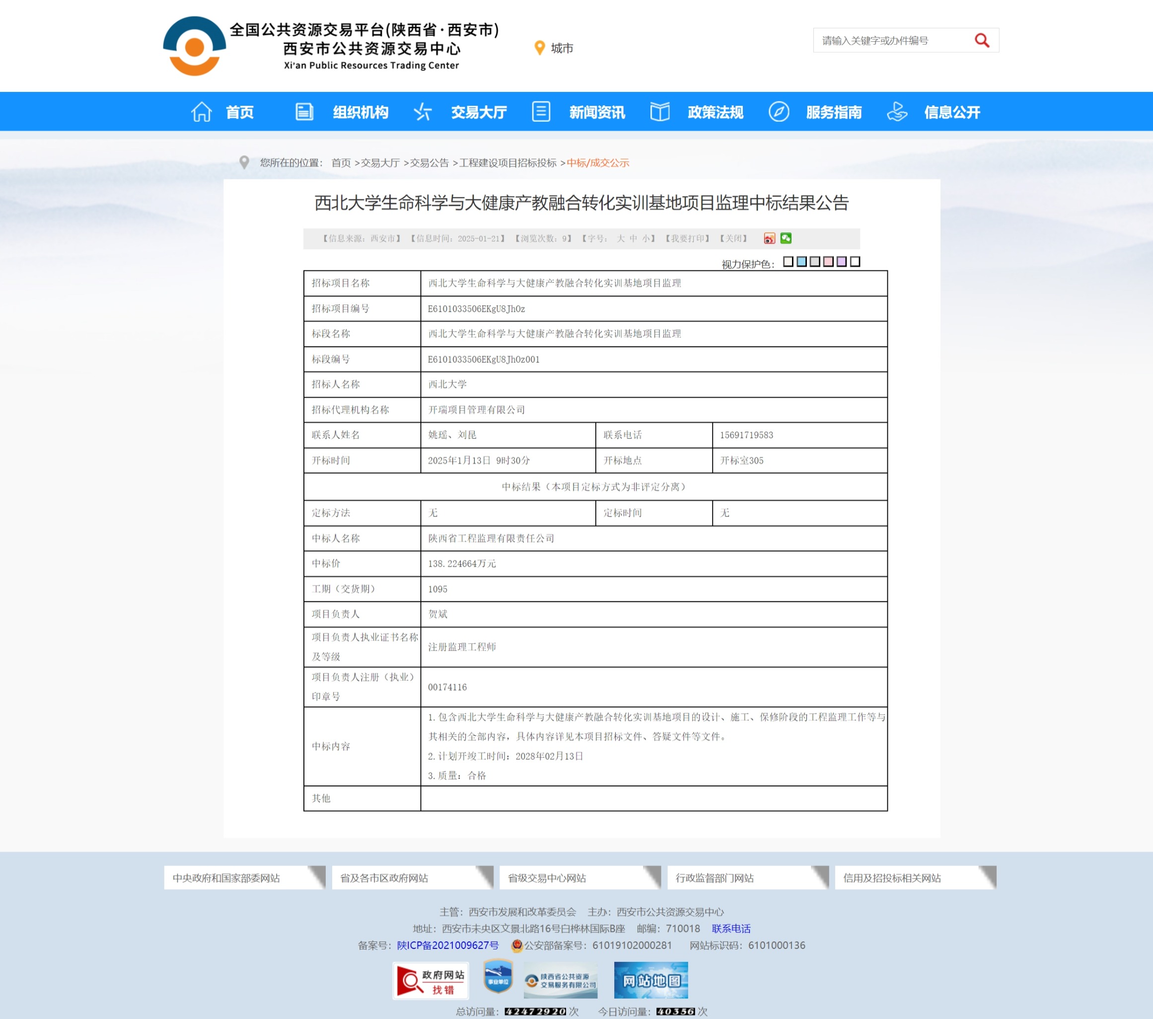 必赢3003no1线路检测中心生命科学与大健康产教融合转化实训基地项目监理中标结果公告