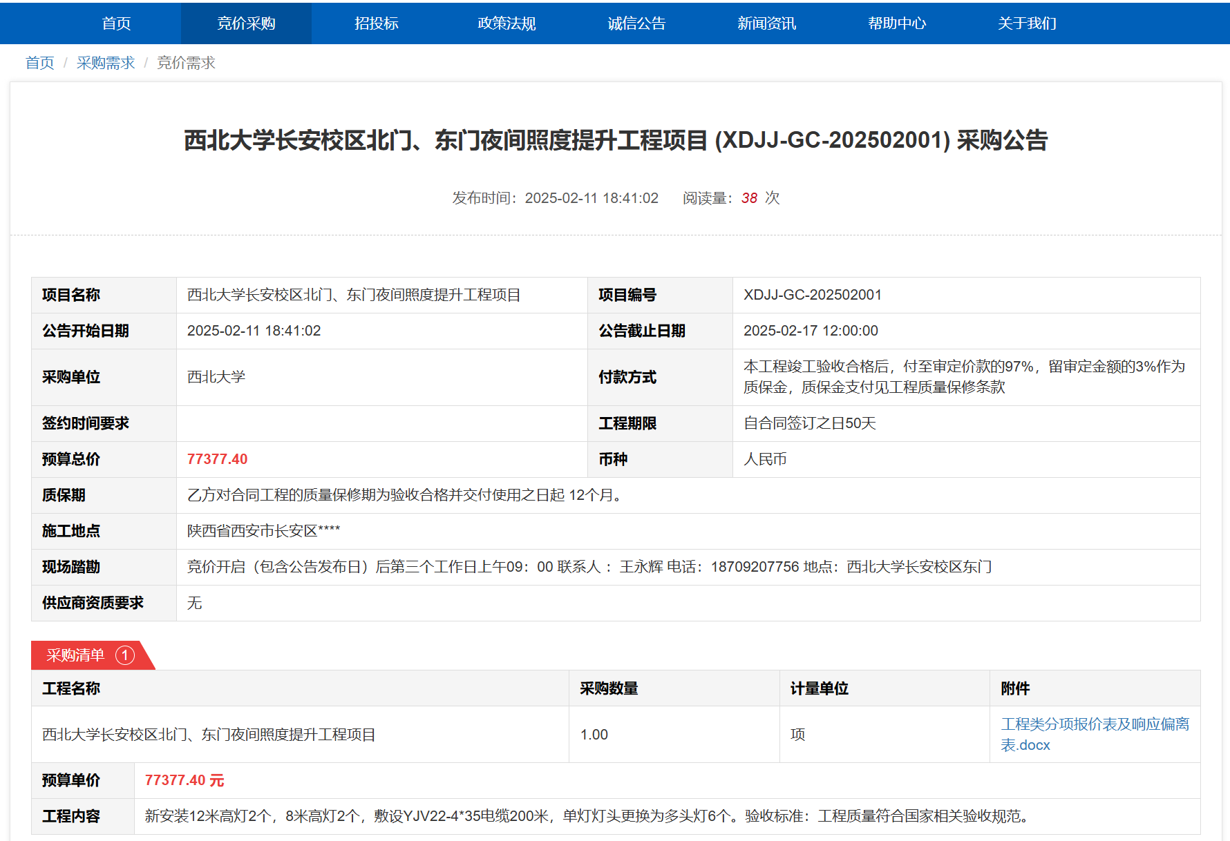 必赢3003no1线路检测中心长安校区北门、东门夜间照度提升工程项目(XDJJ-GC-202502001)竞价采购公告 作者:采购与招标办公室 编辑: 时间:2025-02-11 原公告链接:https://www.ejingcai.com.cn/site/bidding/detail/16497