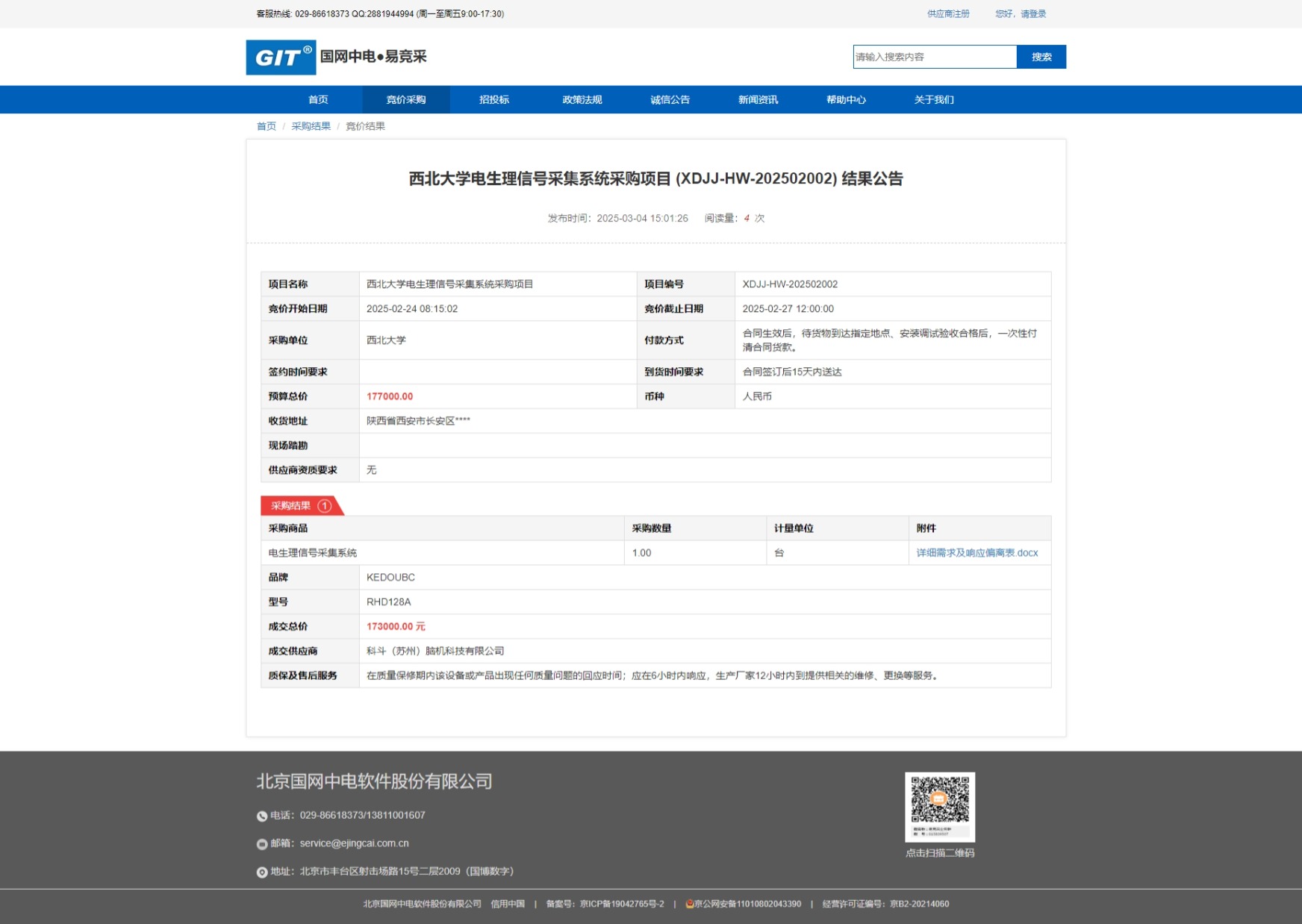 必赢3003no1线路检测中心电生理信号采集系统采购项目 (XDJJ-HW-202502002) 竞价结果公告 作者: 编辑:采购与招标办公室 时间:2025-03-04 原公告链接:https://www.ejingcai.com.cn/site/bidding/detail/16713